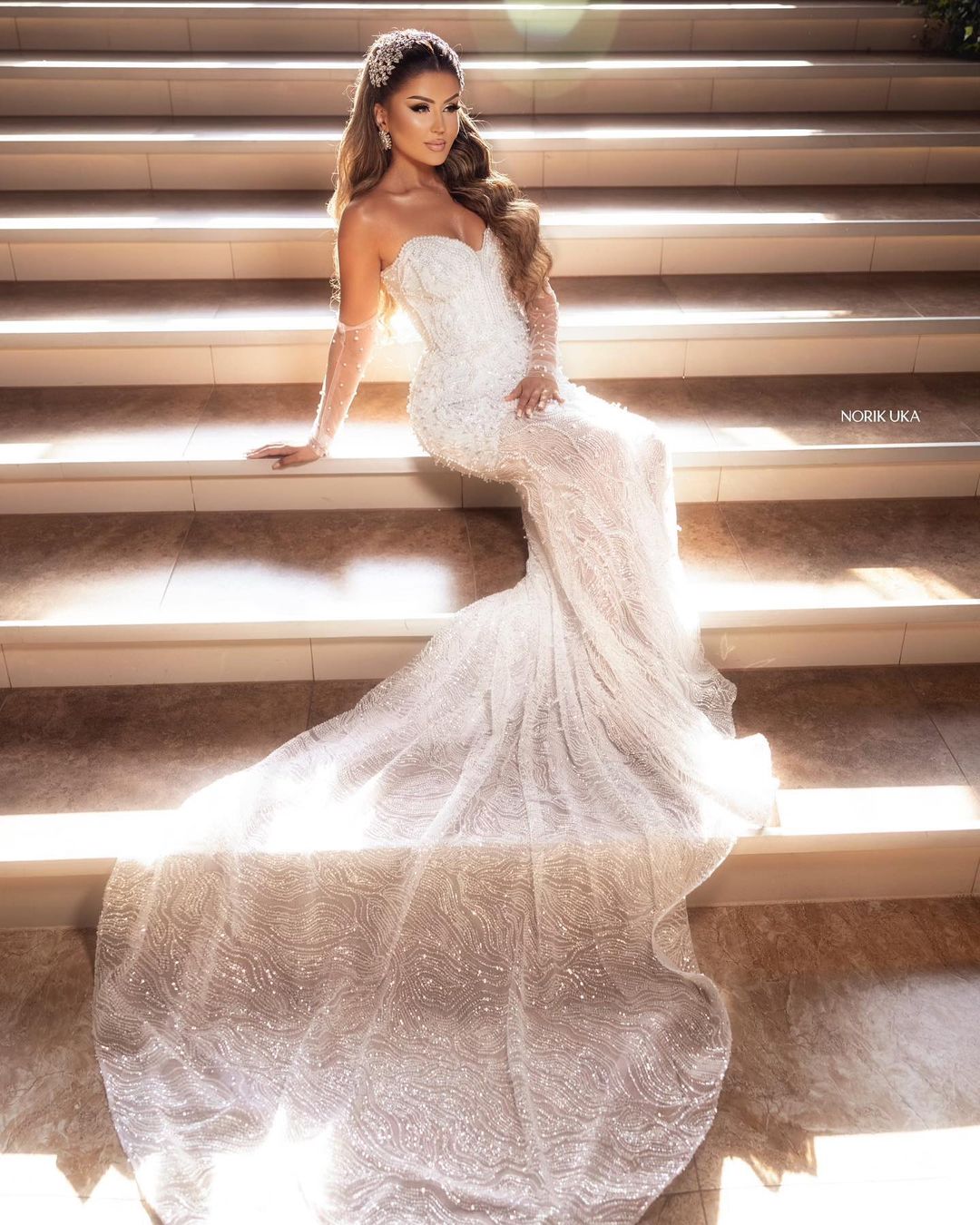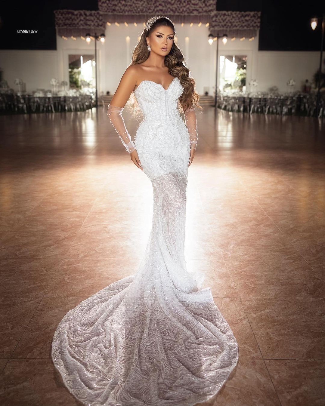 Achieve timeless beauty with this elegant floor-length wedding dress. Crafted with sweetheart neckline. lace fabric and delicate beading. this sleeveless mermaid design is perfect for your special day.