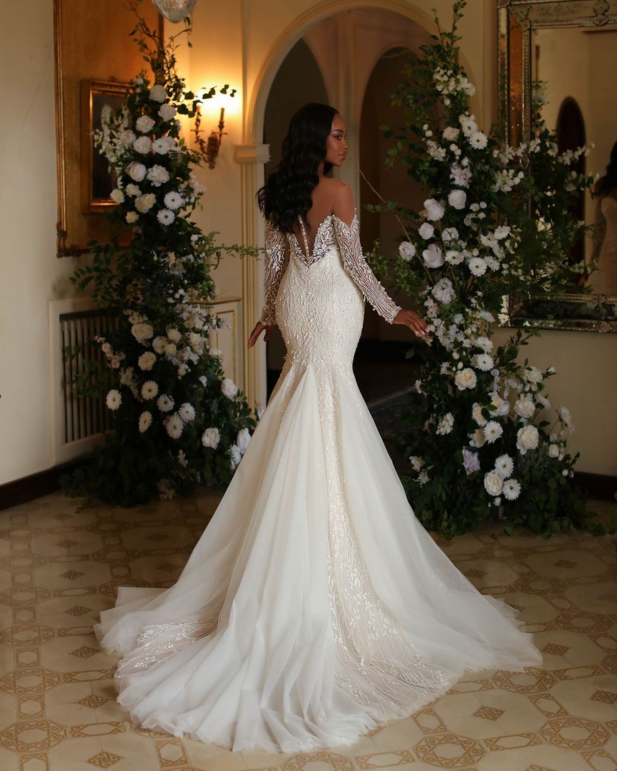 Indulge in sophistication and romance with our Elegant Long Ivory Mermaid Wedding Dress. The long sleeves and lace tulle add an exquisite touch. perfect for your special day. This stunning dress will make you feel confident and beautiful while walking down the aisle.