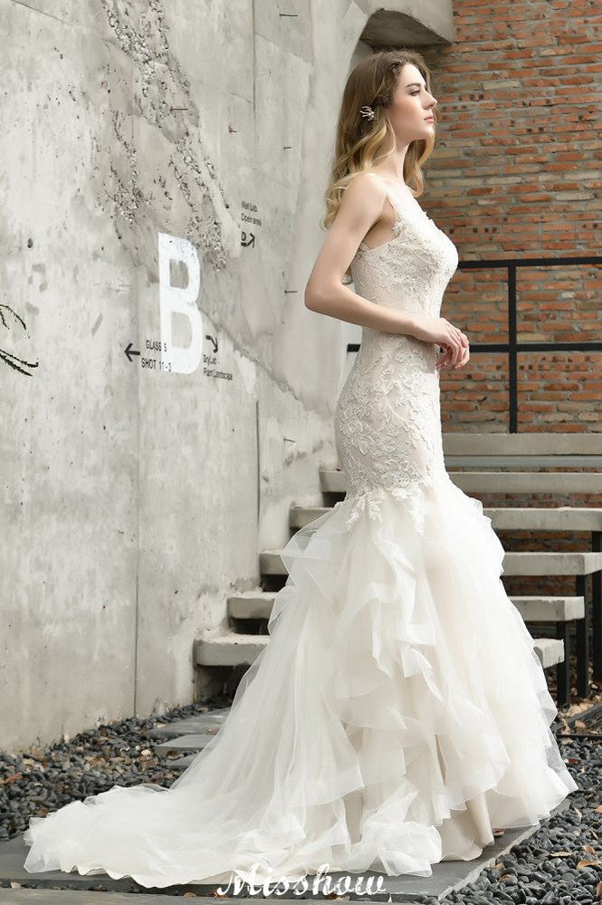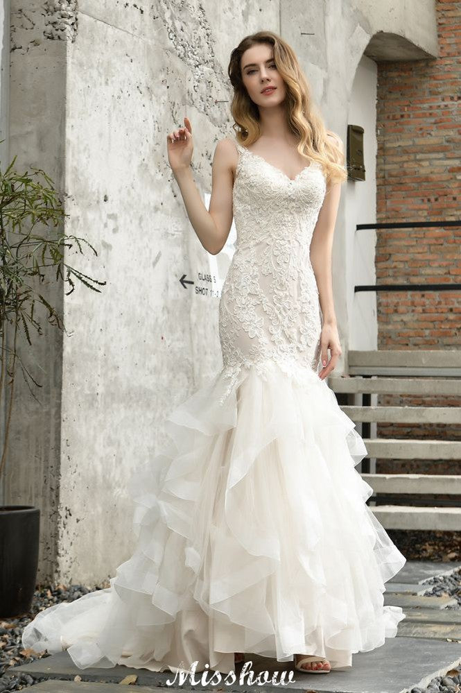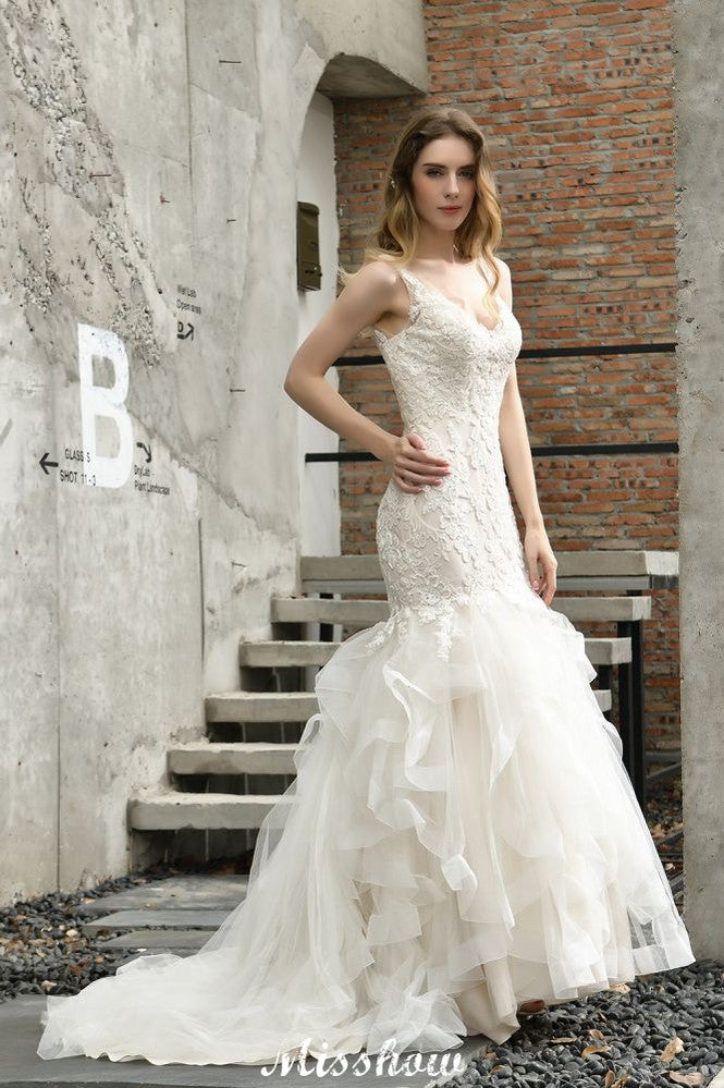Elegant V-Neck Mermaid Bridal Gown Tulle Lace Appliques Puffy Wedding Dress