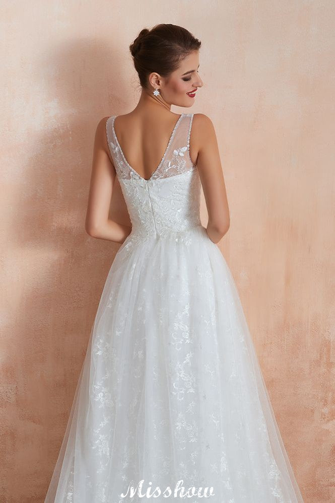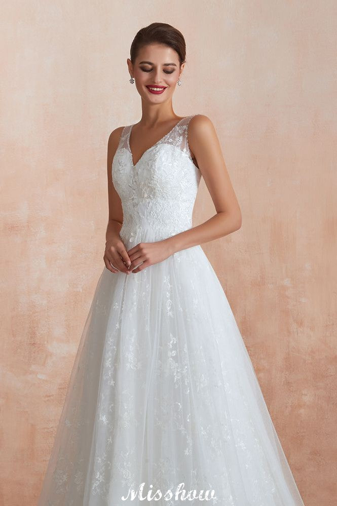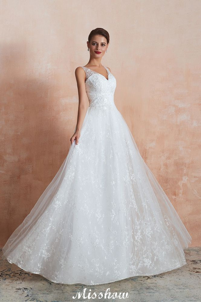 Elegant White V-Neck Princess Wedding Dress Aline Tulle Lace Bridal Gown