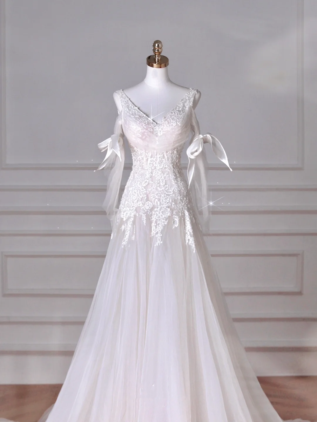Fairy White V Neck Tulle Lace Appliques Mermaid Evening Dress,Long Wedding Dress Y8636