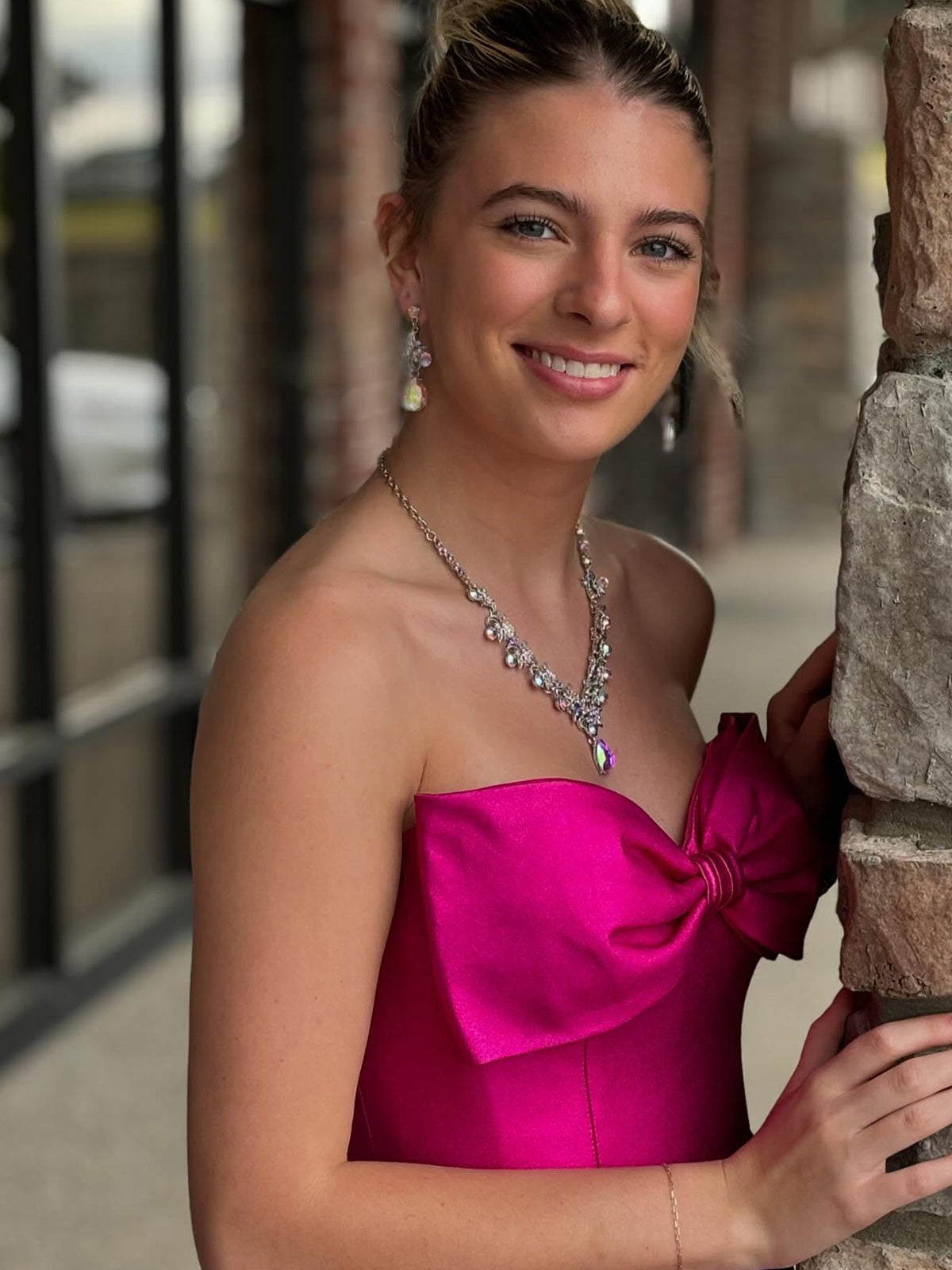 This stunning mermaid-style gown in luxurious satin is available in enchanting shades of blue and pink. perfect for making a statement. A stylish choice suitable for both evening dresses and formal dresses. with its elegant strapless neckline that beautifully frames the shoulders. enhancing its sleek. sophisticated appeal. The fitted bodice hugs the figure. flowing into a dramatic floor-length for a graceful silhouette that exudes glamour. A lace-up back not only provides an adjustable fit but also adds a touch of romance. A charming bow embellishment adds a playful yet refined accent. making this gown ideal for any formal occasion where elegance meets modern style.