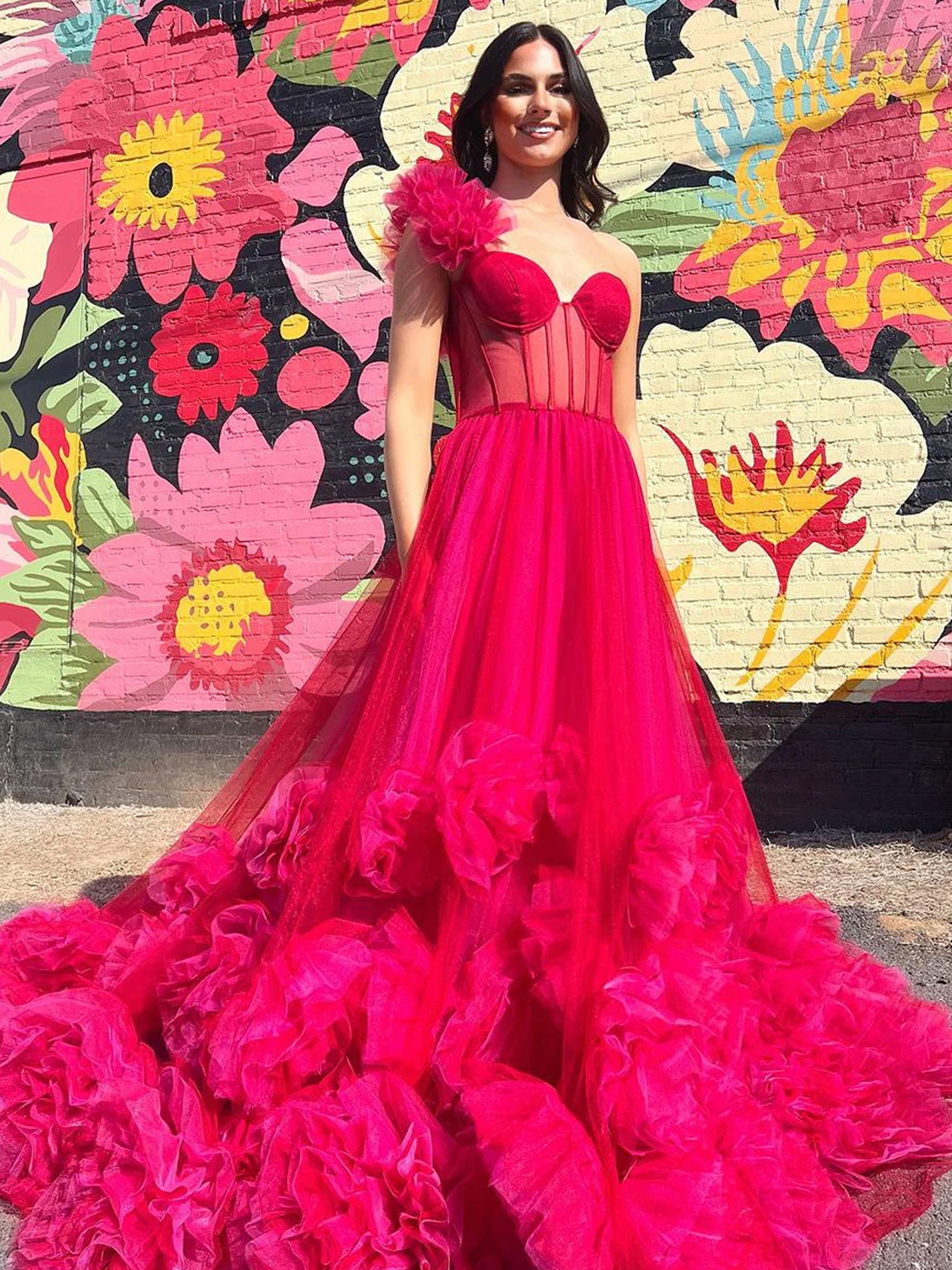 Step into a fairytale with the Hot Pink Ball Gown One-Shoulder Tulle Prom Dress. This dress is crafted from luxurious tulle and features a vibrant hot pink color that radiates joy and confidence. A stylish choice suitable for both evening dresses and formal dresses. with its ball gown silhouette. offering a voluminous skirt that flows beautifully to a court train. creating a dramatic effect that is sure to turn heads. The one-shoulder neckline adds a unique twist. elegantly showcasing your shoulders while maintaining a sophisticated allure. The delicate ruffles and enchanting floral embellishments capture the essence of romance and charm. The lace-up back not only provides an adjustable fit for maximum comfort but also adds a beautiful detail to the overall design.