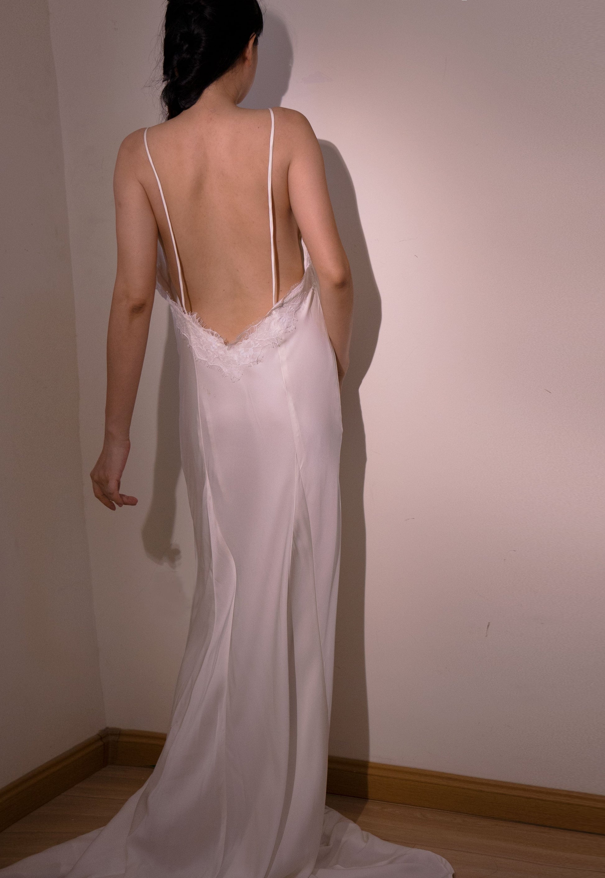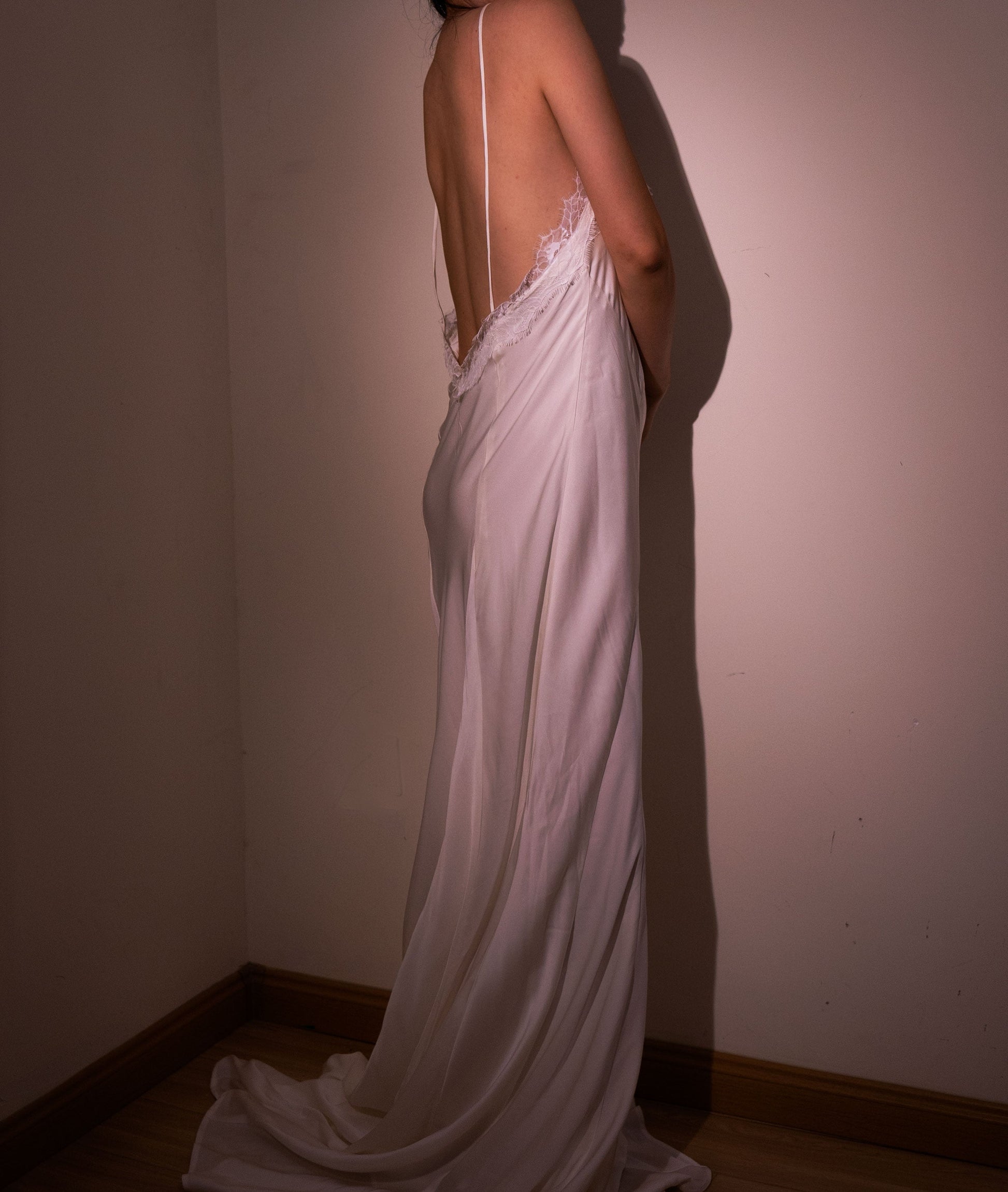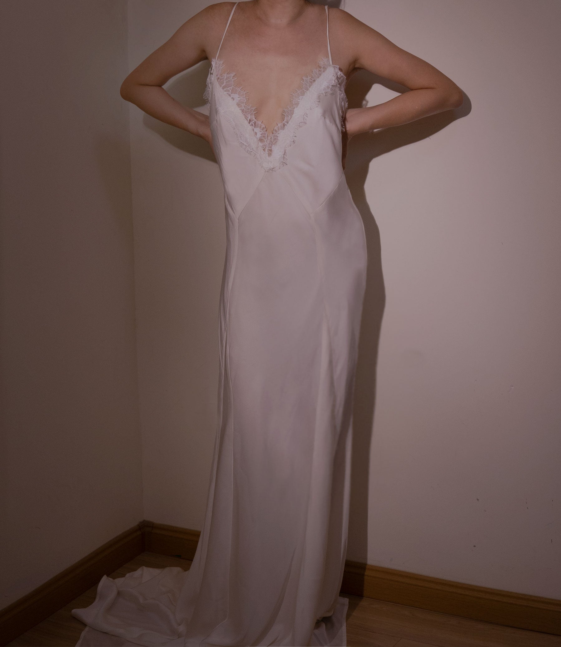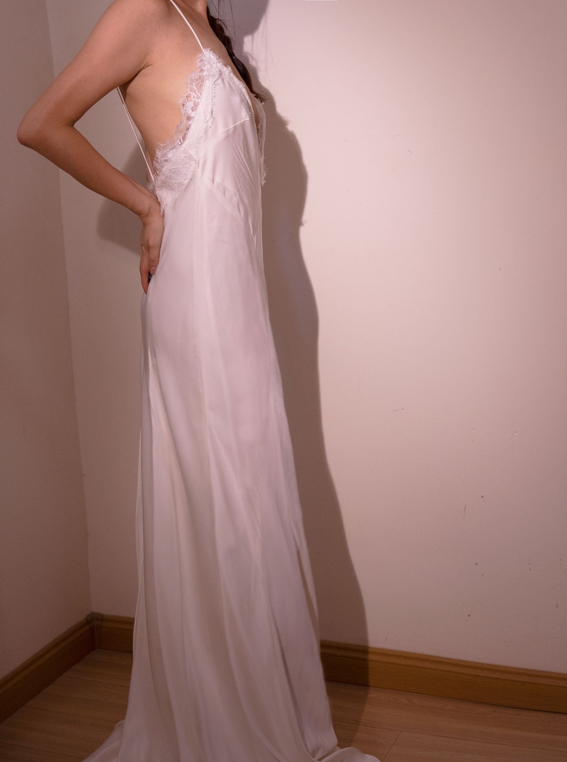 This white bridal gown. named GENEVIEVE. is a stunning silhouette that exudes elegance and sophistication. It features iconic and exclusive soft stretch lace. adding a touch of uniqueness to the design. The gown is meticulously crafted with exquisite eyelash detailing around the V neckline and low back. enhancing its overall allure. It comes with spaghetti straps. 100% luxurious lining. and a 40cm train. adding to its grandeur. This silhouette gown is truly a dream dress for the woman who radiates confidence and individuality.