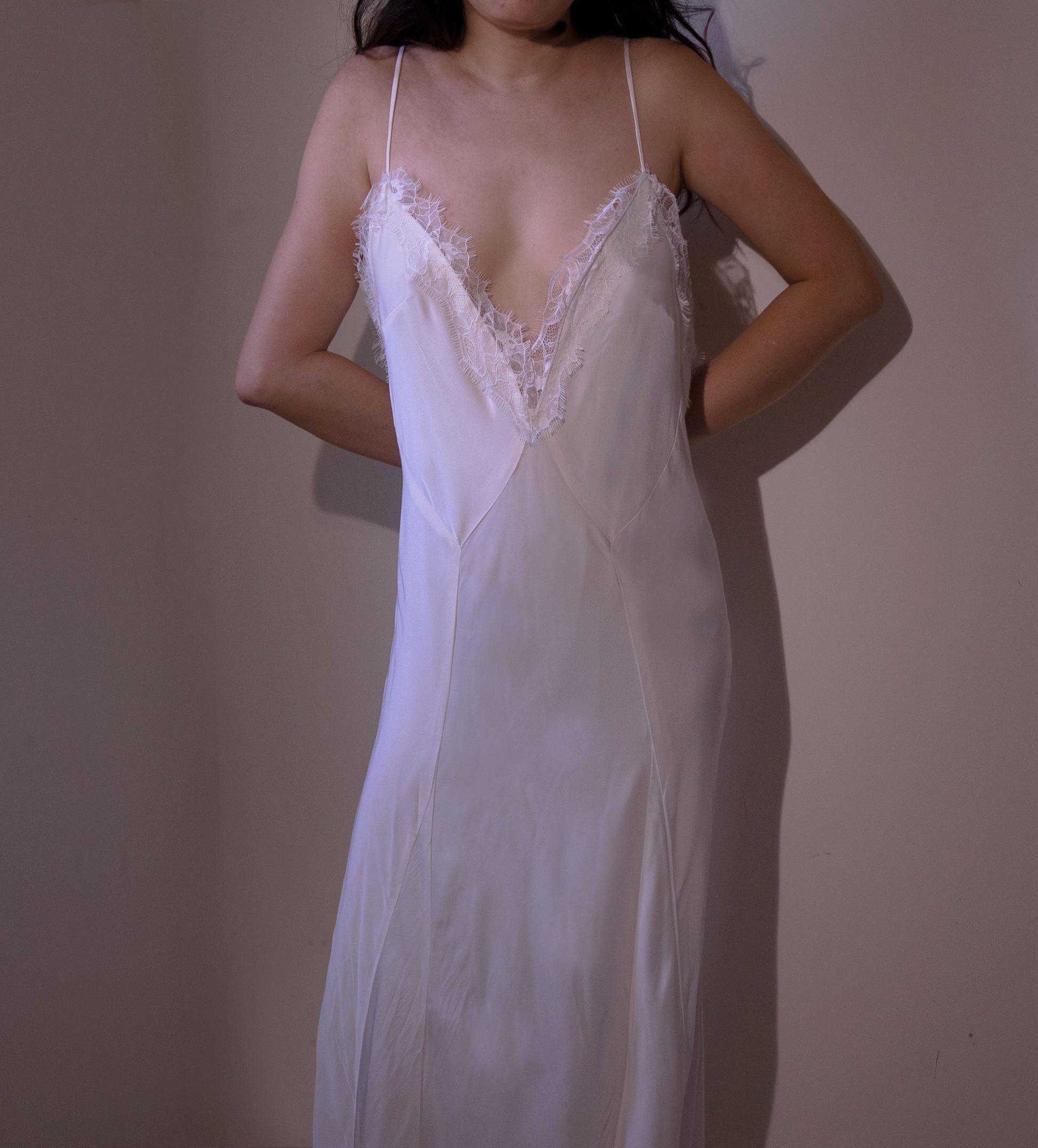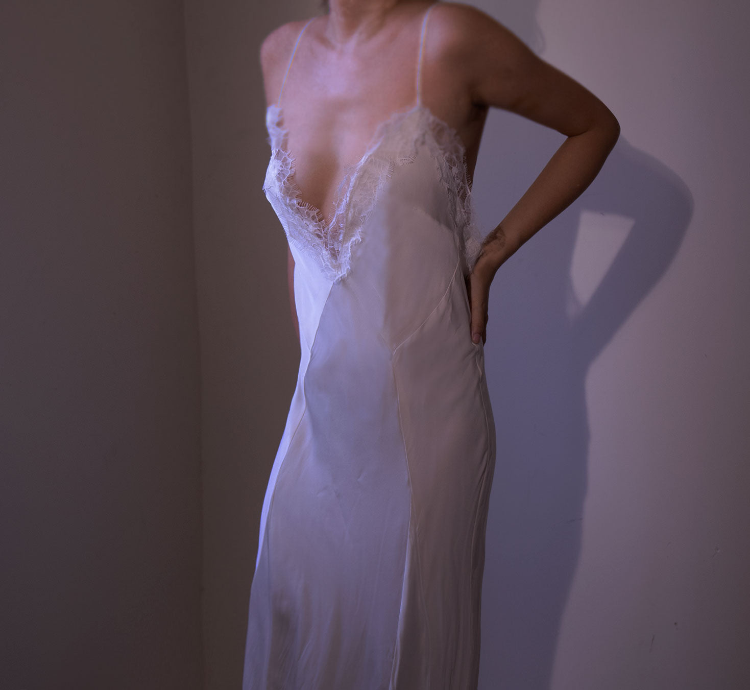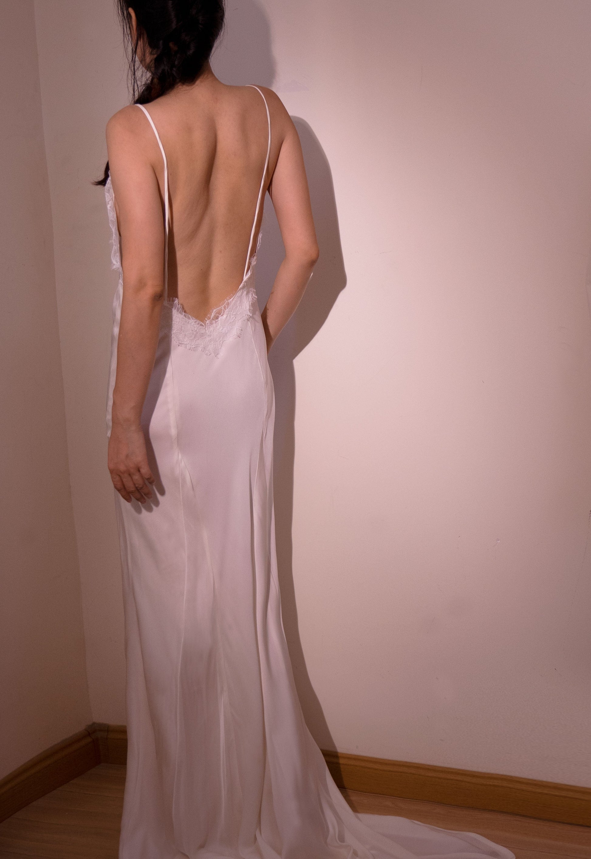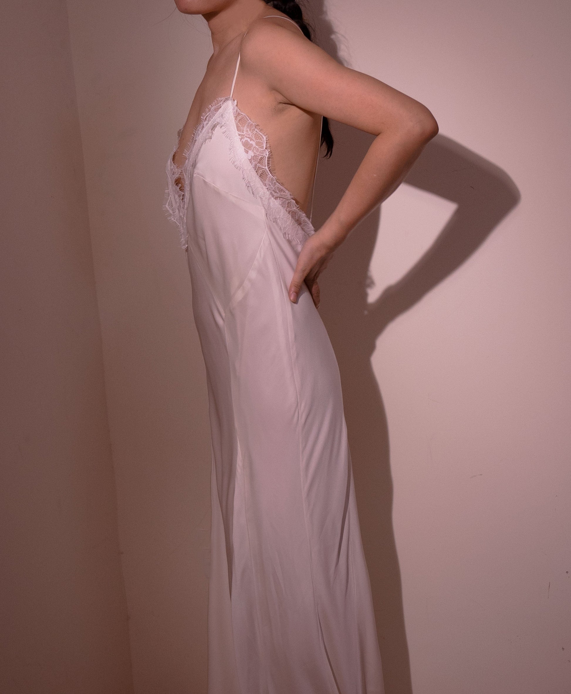 This white bridal gown. named GENEVIEVE. is a stunning silhouette that exudes elegance and sophistication. It features iconic and exclusive soft stretch lace. adding a touch of uniqueness to the design. The gown is meticulously crafted with exquisite eyelash detailing around the V neckline and low back. enhancing its overall allure. It comes with spaghetti straps. 100% luxurious lining. and a 40cm train. adding to its grandeur. This silhouette gown is truly a dream dress for the woman who radiates confidence and individuality.