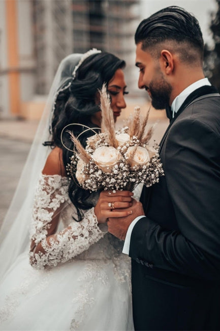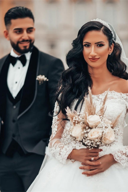 Gorgeous White Long Sleeves Lace Ball Gown Aline Floral Tulle Wedding Dresses