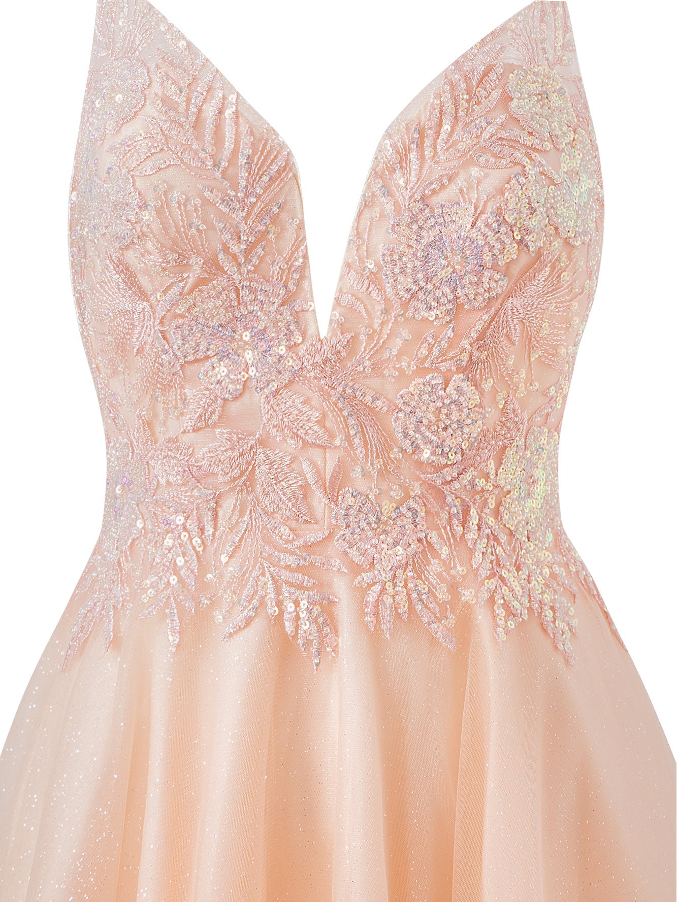 Introducing Grace. an A-line short spaghetti strap homecoming dress. designed to make you feel like the belle of the ball. Dress Grace is designed with your comfort in mind. The spaghetti straps and Plunge V neckline provide a chic yet comfortable fit. making it perfect for any event. Its glitter tulle fabric subtly shimmers in the light. while the delicate lace appliques. beadings. and dazzling sequins on the bodice add a dash of drama. The dress comes in an enchanting blush color. universally flattering and in line with the latest fashion trends.
