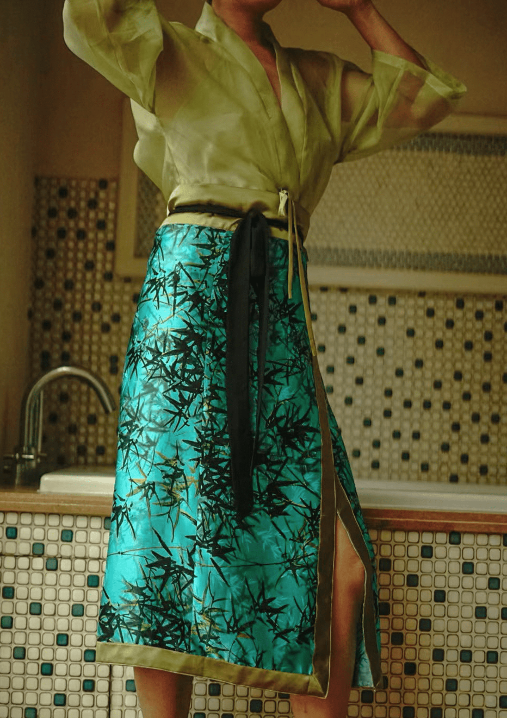 This is a modern two-piece tang dynasty traditional culture inspired set. Tie your ru top round your waist then put top in bottom skirt