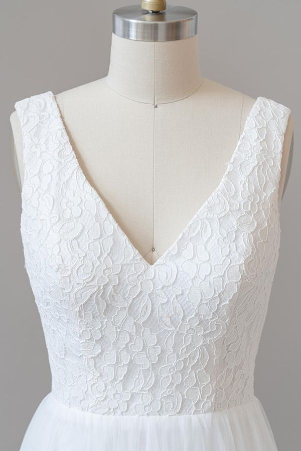 Long A-line Open Back V-neck Lace Tulle Wedding Dress