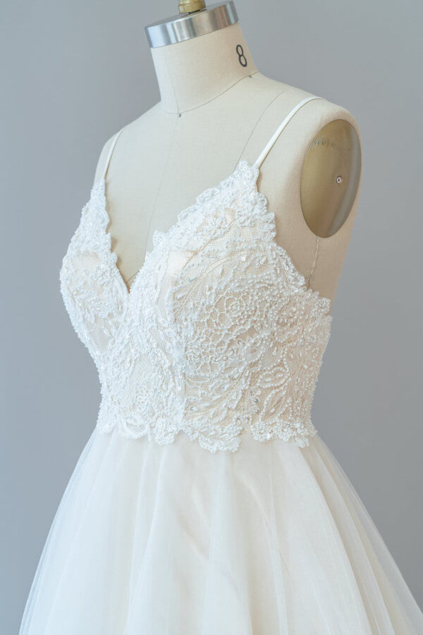 Long A-line Spaghetti Strap Lace Tulle Backless Wedding Dress