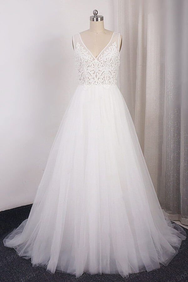 Long A-line V-neck Appliques Lace Tulle Wedding Dress
