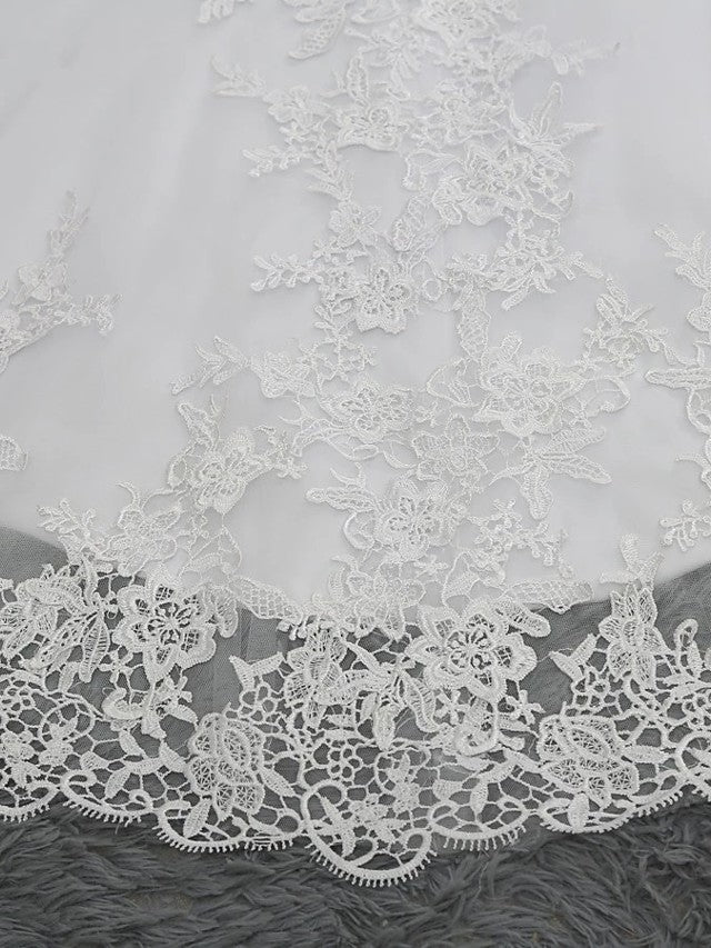 Long Mermaid V Neck Tulle Lace Backless Wedding Dresses with Cap Sleeves