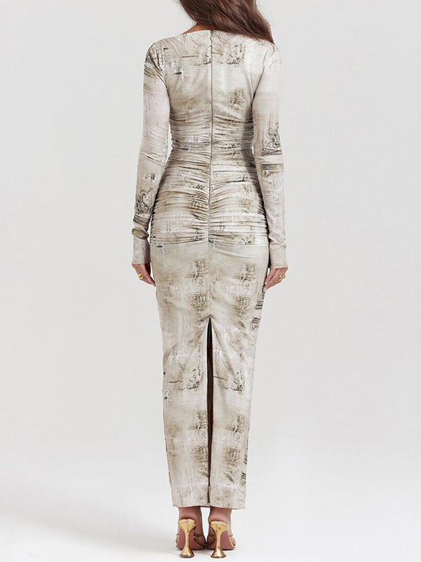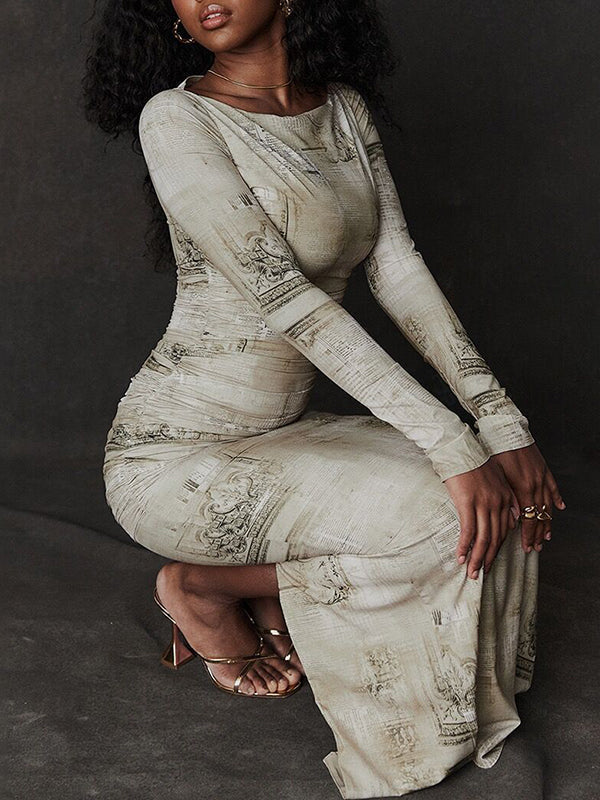 Long Sleeves Skinny Printed Split-Back Split-Joint Round-Neck Evening Dresses Maxi Dresses
