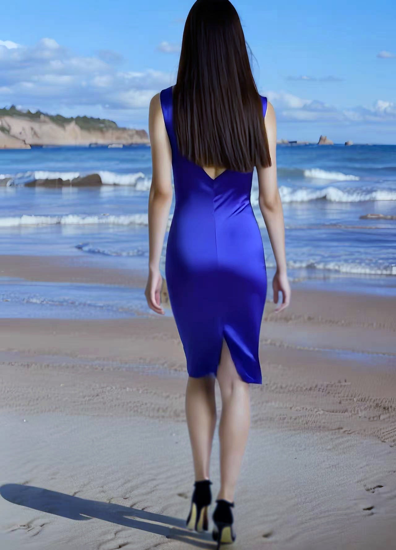 - Model wearing Color no.11 sapphire blue in marcie dress from swatches