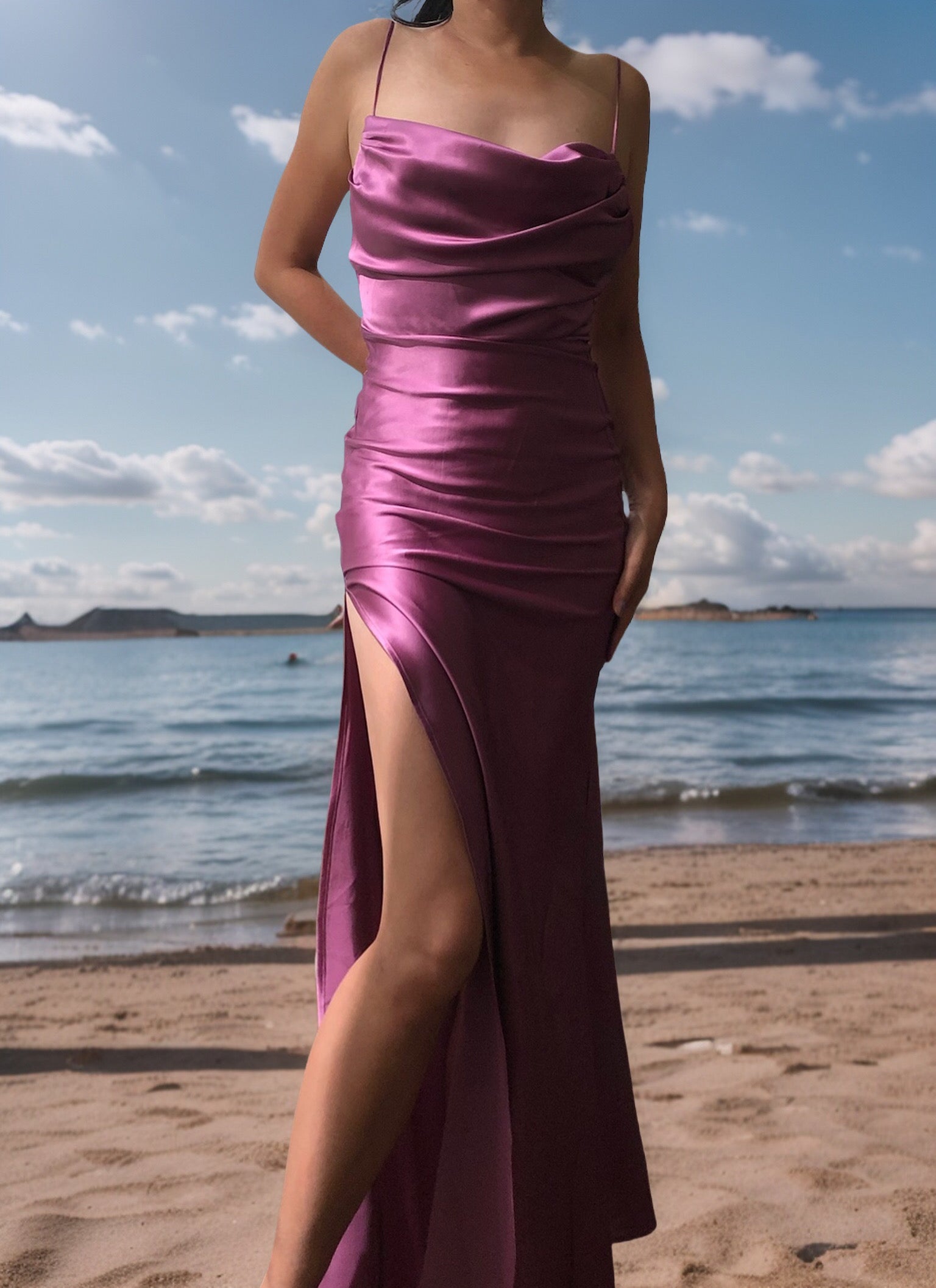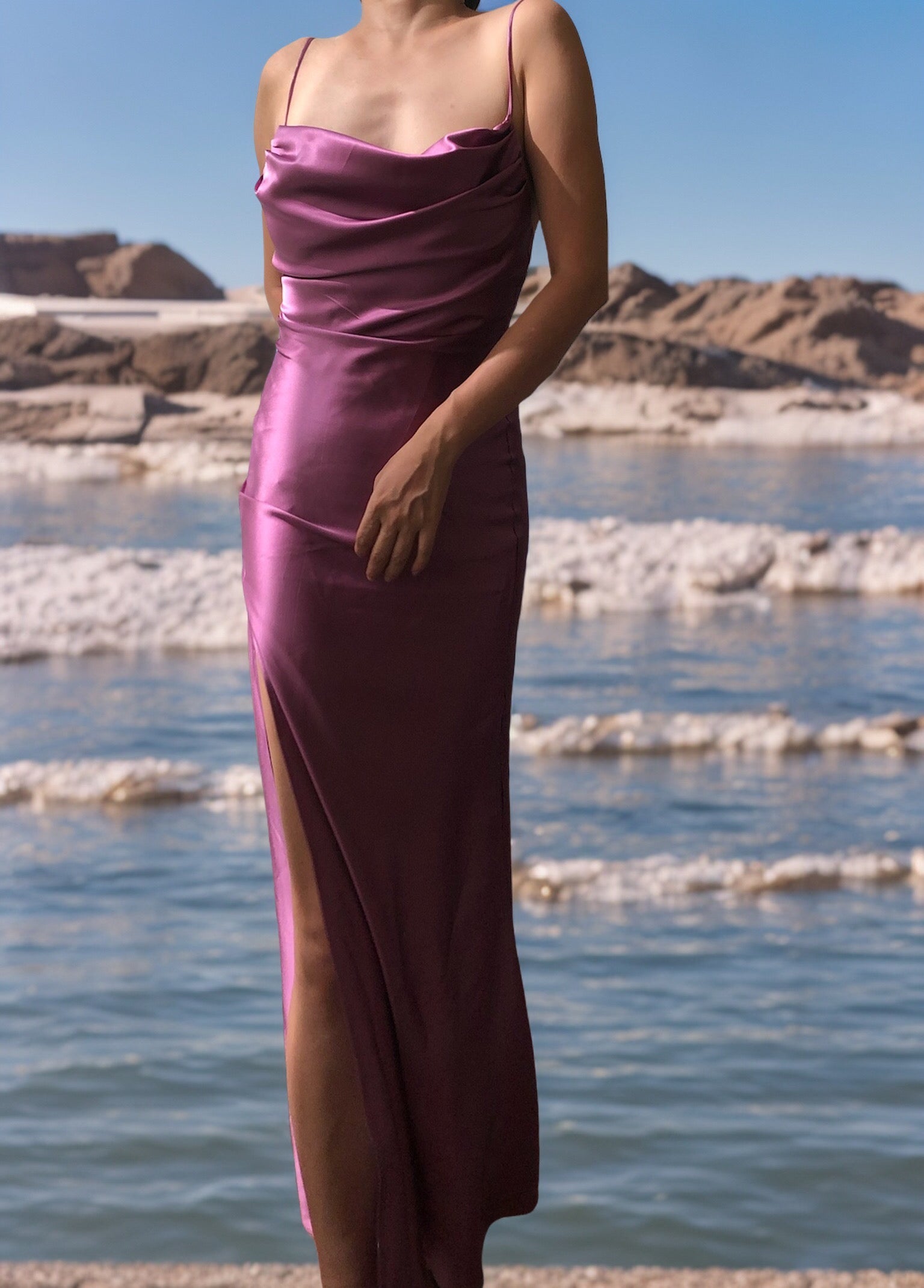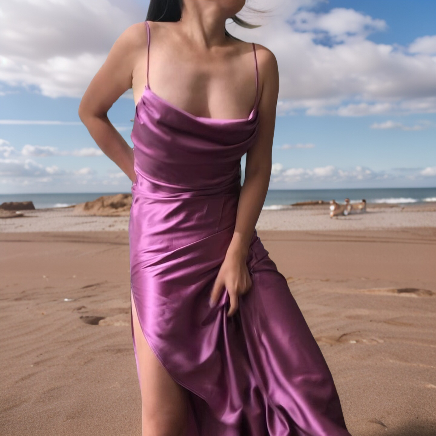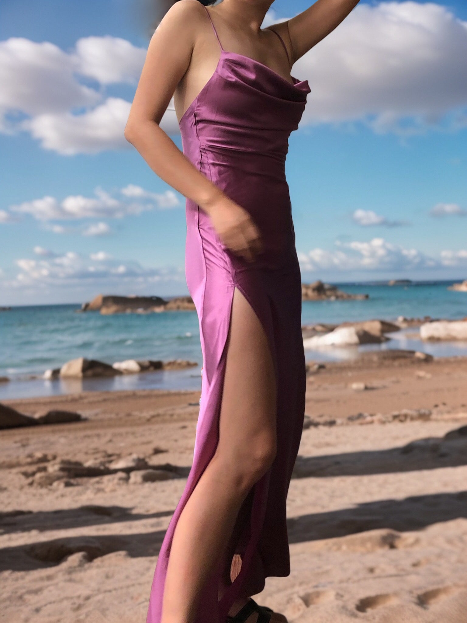 The design features an elegant cowl neckline adorned with delicate ruffled details. echoing the song's romantic mystery. Its bias cut sculpts a figure-flattering silhouette. while the graceful side slit adds a touch of liberation and fluidity with every step.
