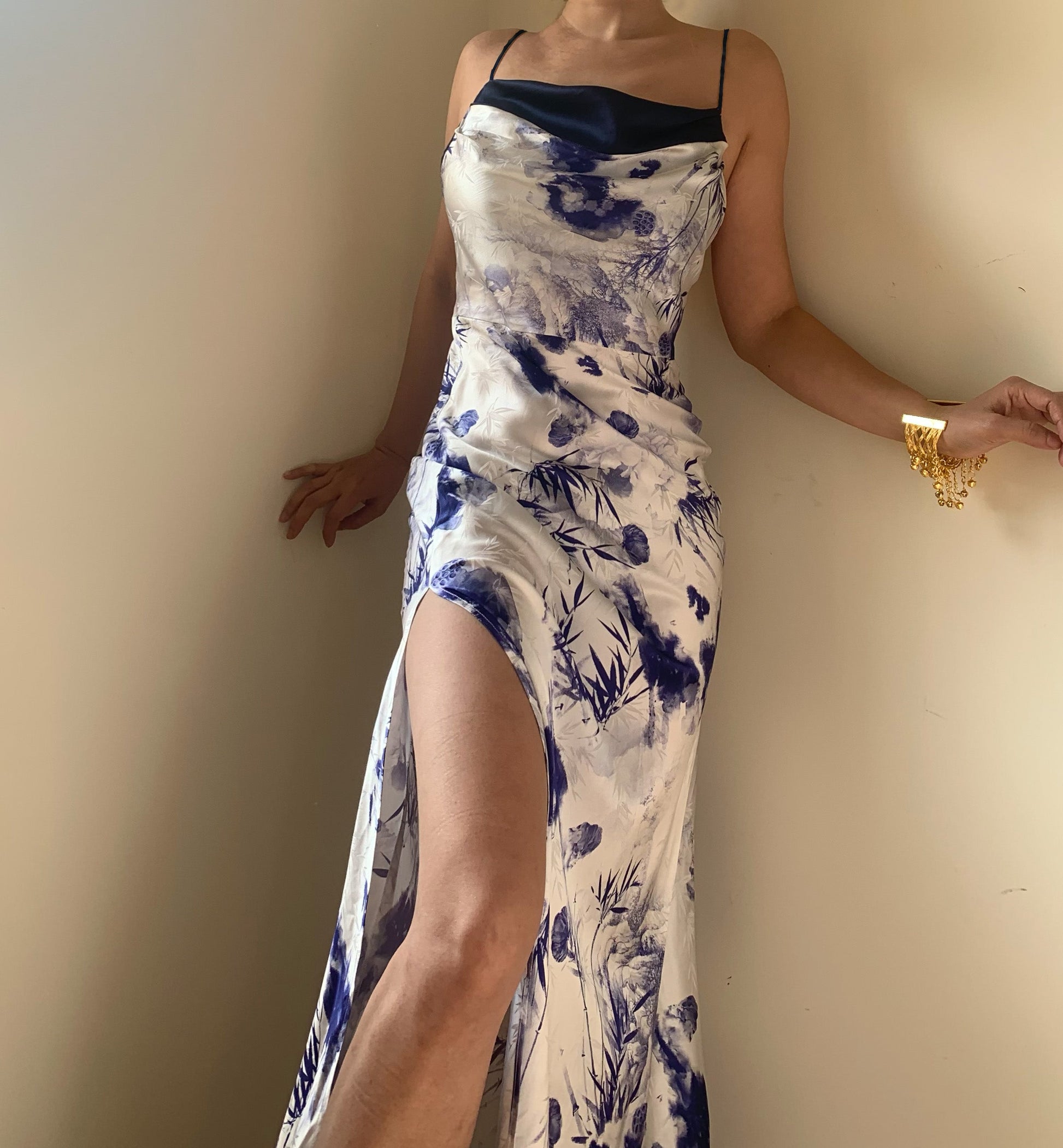 The design features an elegant cowl neckline adorned with delicate ruffled details. echoing the song's romantic mystery. Its bias cut sculpts a figure-flattering silhouette. while the graceful side slit adds a touch of liberation and fluidity with every step.