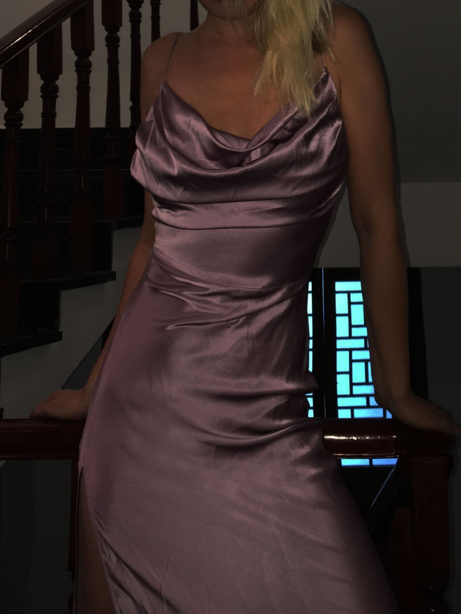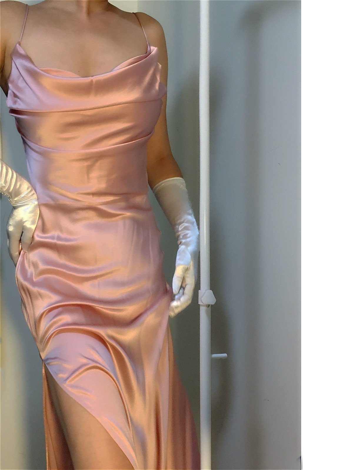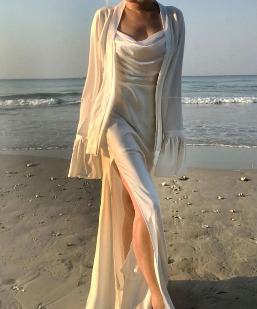 The design features an elegant cowl neckline adorned with delicate ruffled details. echoing the song's romantic mystery. Its bias cut sculpts a figure-flattering silhouette. while the graceful side slit adds a touch of liberation and fluidity with every step.