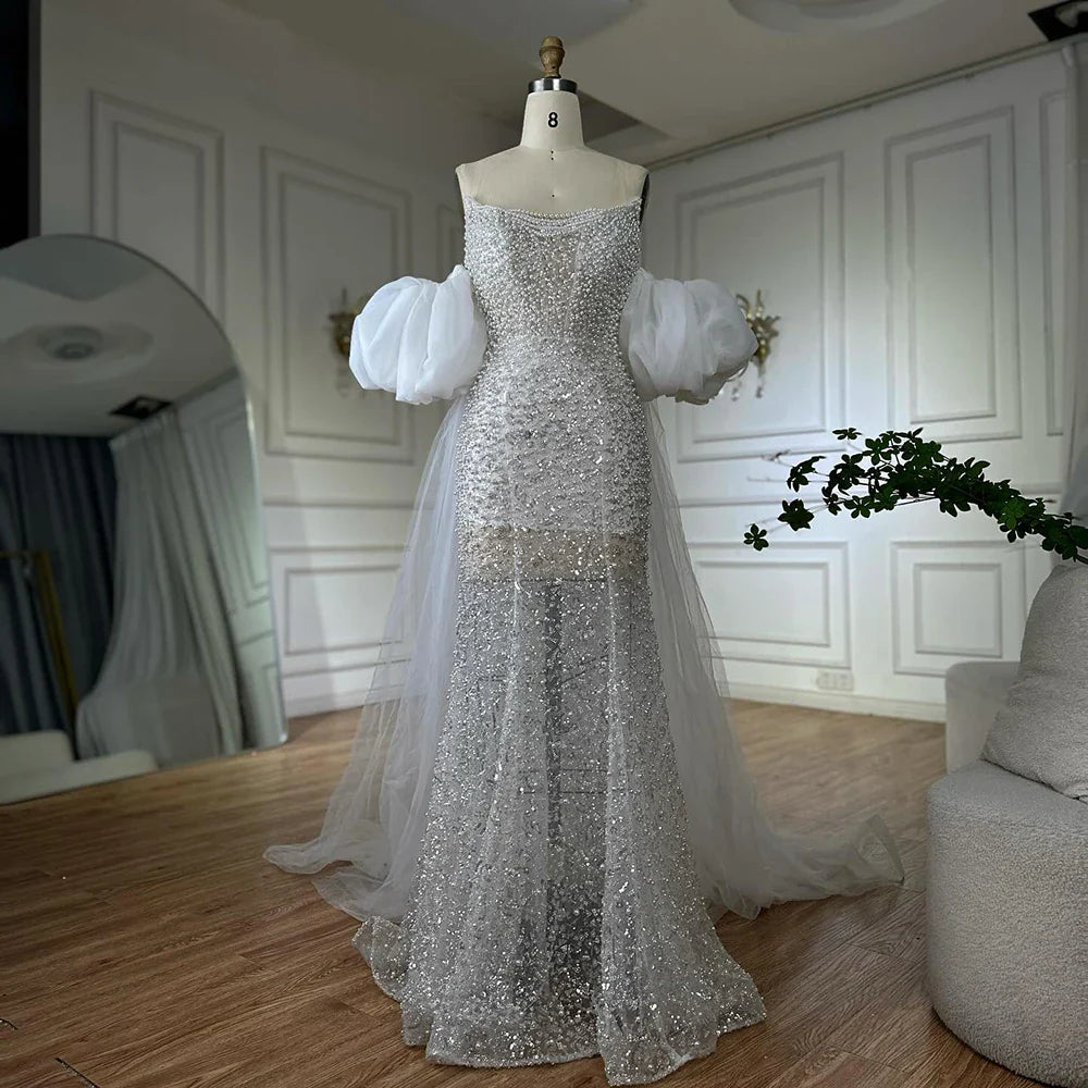 Nude Beaded Evening Gown with Vintage Half Puff Sleeves LA72653A