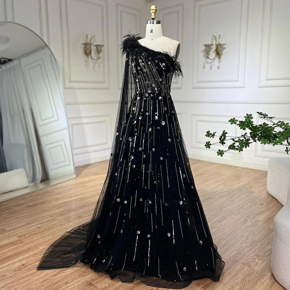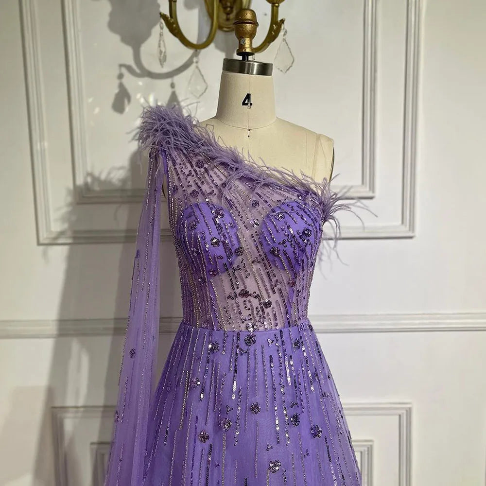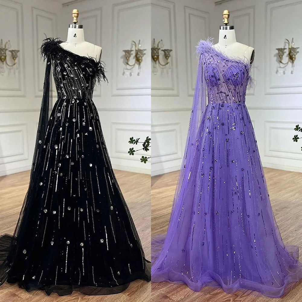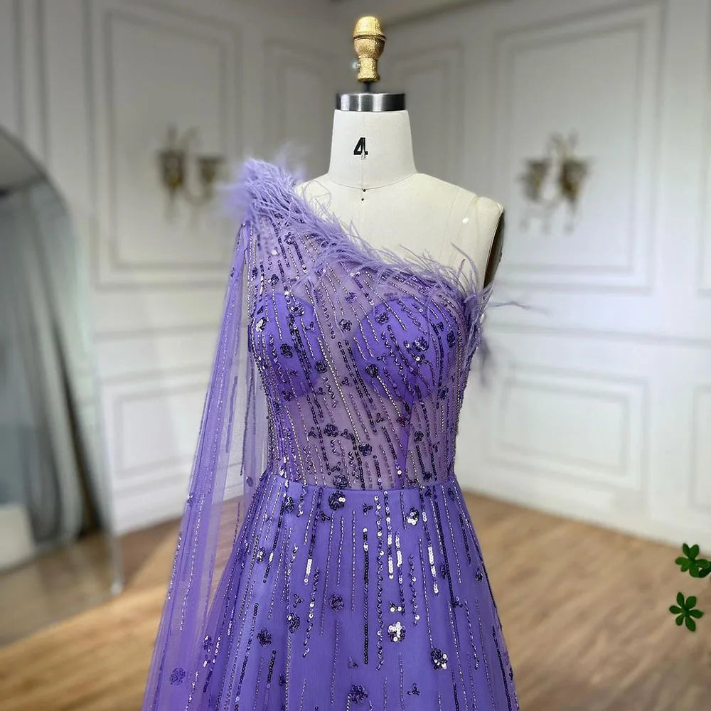 Lilac A Line One Shoulder Cape Sleeves Feathers Beaded Luxury Evening Dresses Gowns for Women Wedding Party LA72503A