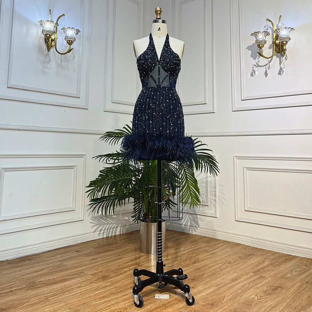 Lilac Sexy Mermaid Halter Off Shoulder Short Evening Dresses Luxury Beaded Feather Mini Gowns 2025 For Women Party LA72037