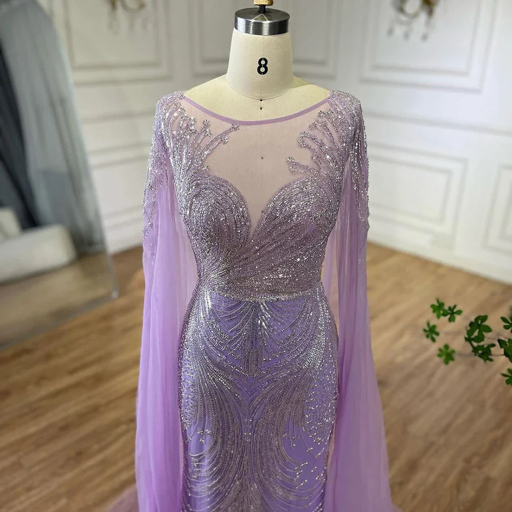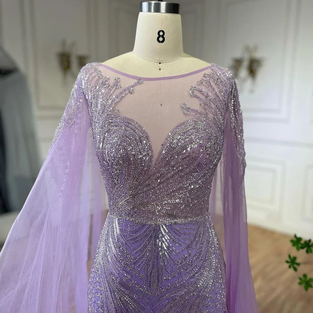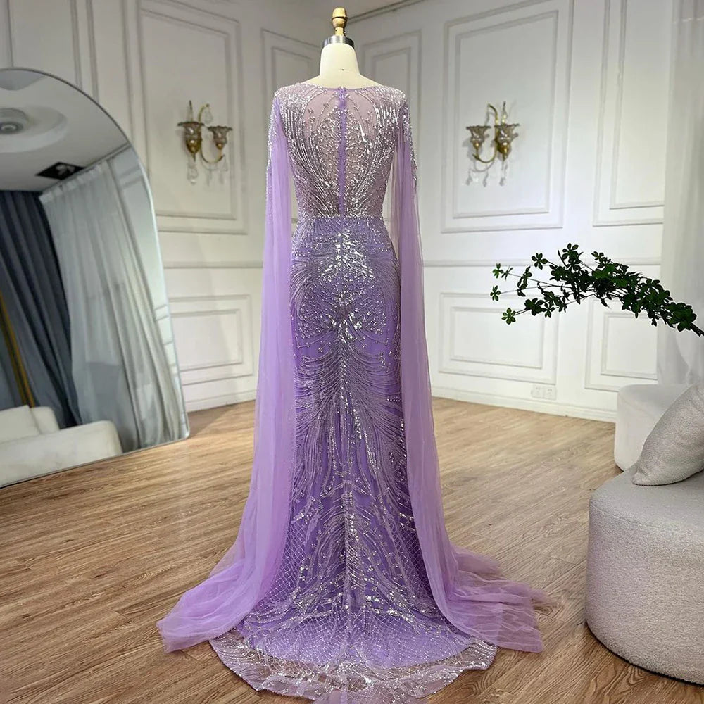 Luxury Dubai Arabic lilac Elegant Cape Sleeves Mermaid Beaded Evening Dresses Gowns For Woman Party 2025 LA72532