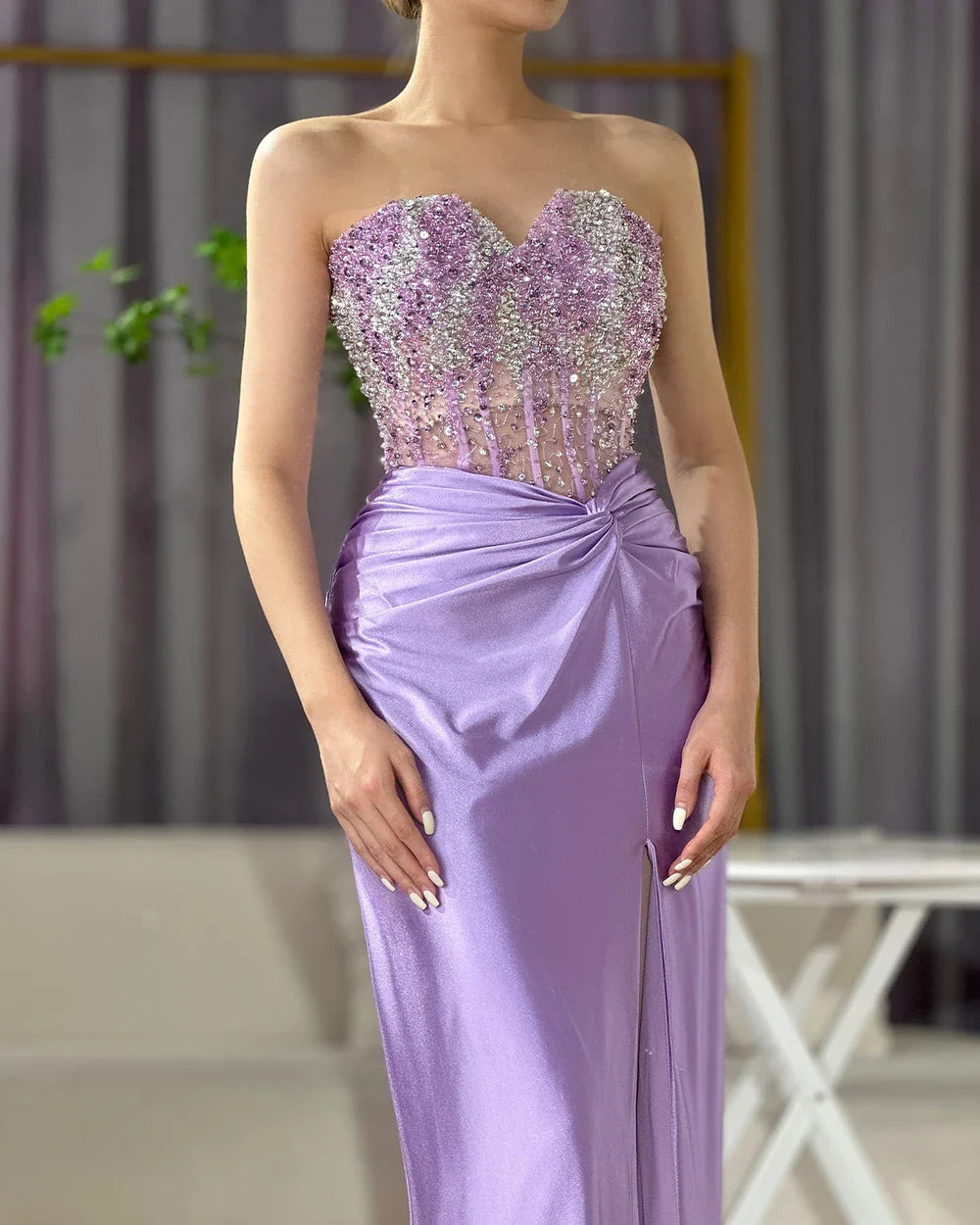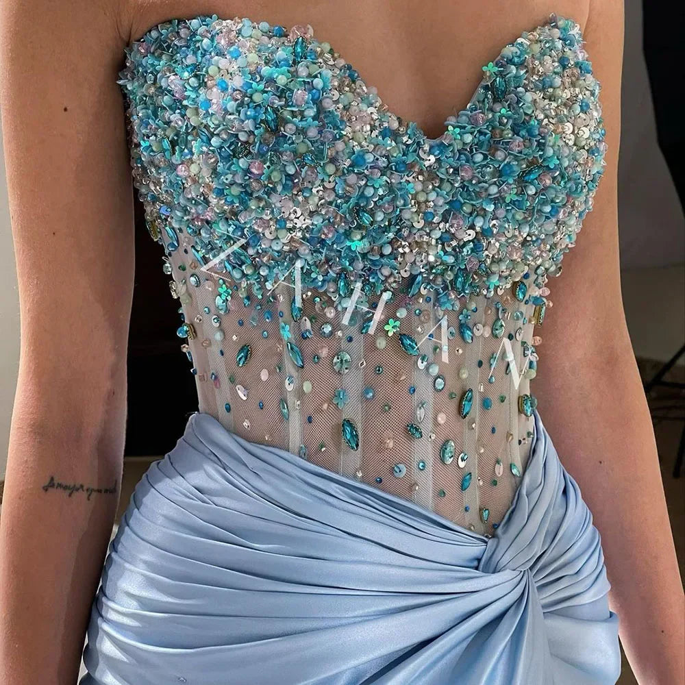 Luxury Dubai Lilac Split Strapless Mermaid Beaded Arabic Evening Dresses Gowns for Women Wedding Party 2025 LA72329