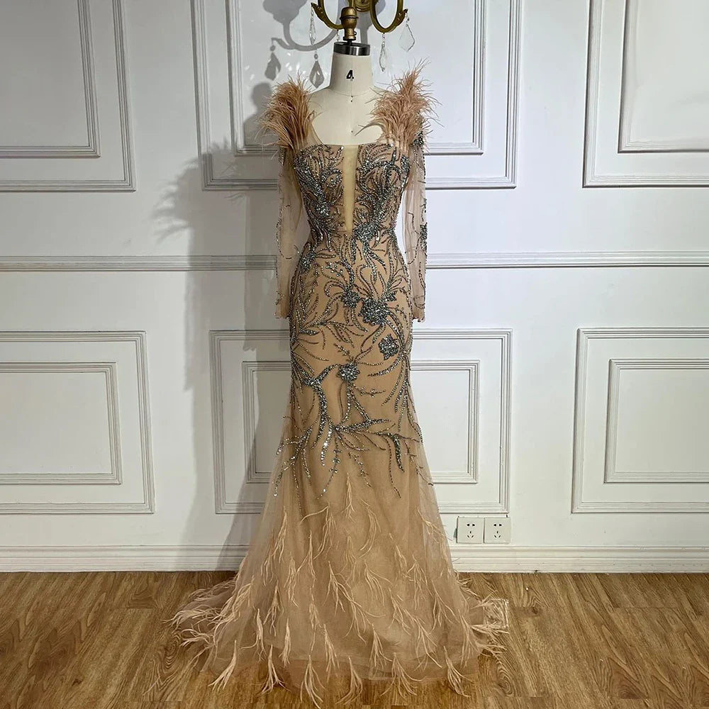 Luxury Dubai Nude One Shoulder Beaded Feathers Mermaid Evening Dresses Gowns for Women Wedding Party Gown LA72508