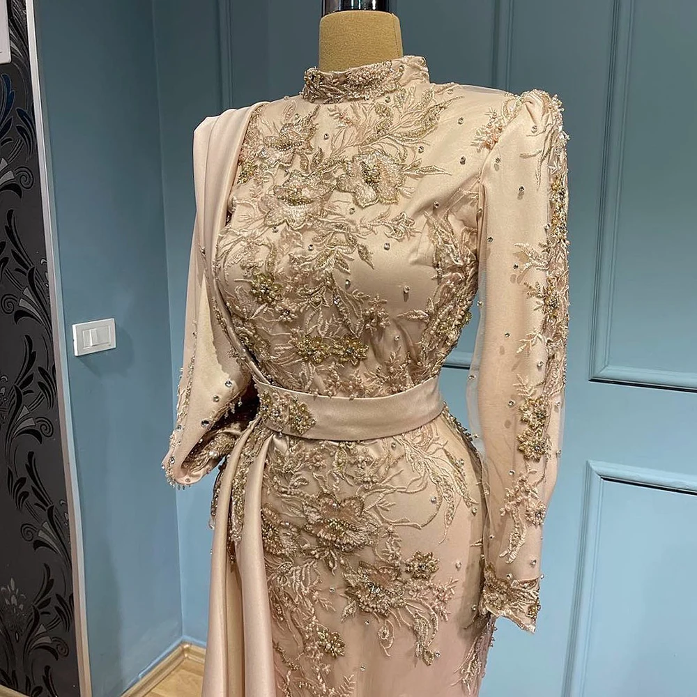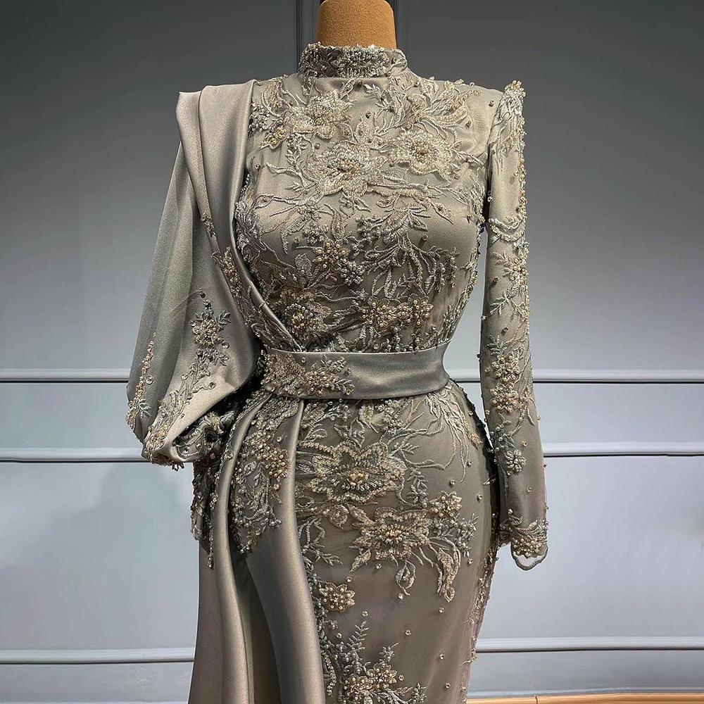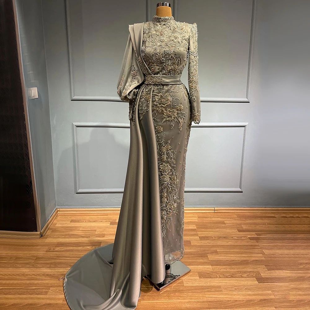 Moslim Grey Mermaid Avond Jurken 2025 Luxe Kralen Elegante Overrok Satijn Voor Vrouwen Party LA71543