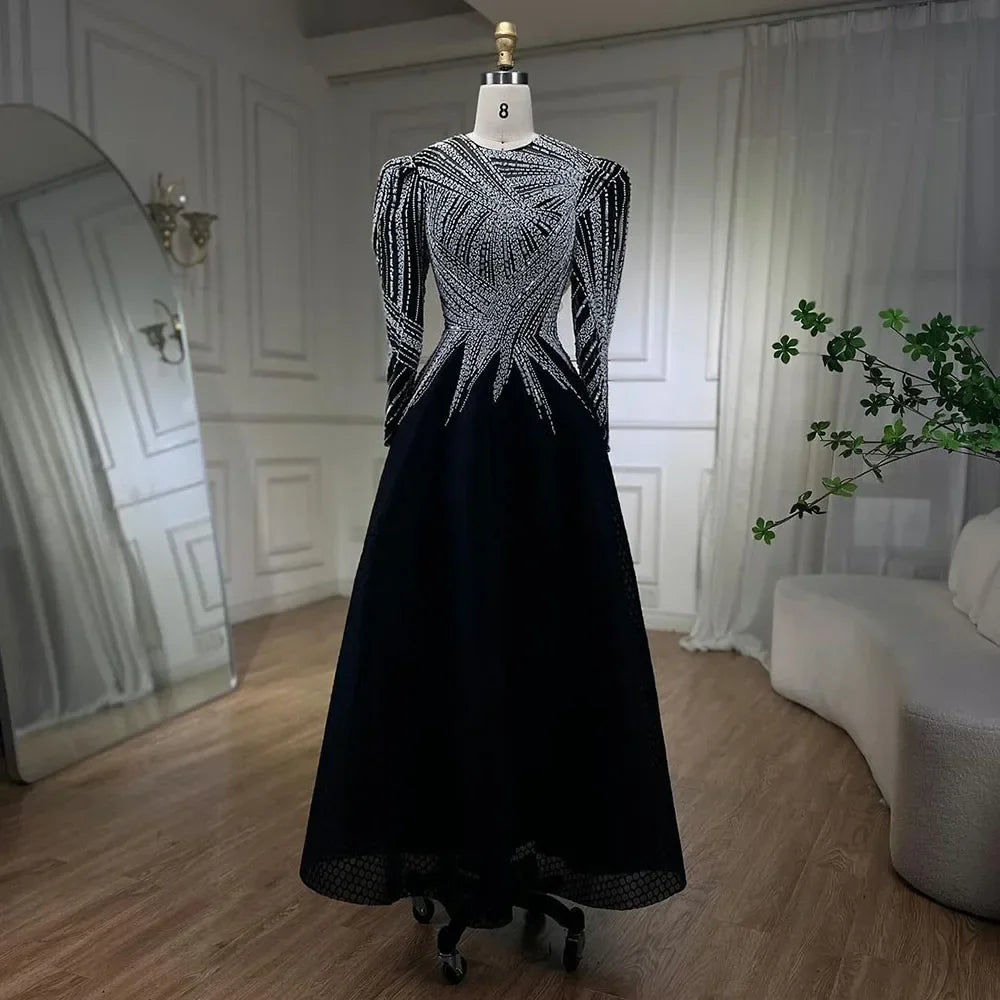 Muslim Black A-Line Midi Luxury Beaded Ankle Length Evening Dresses Gowns 2025 For Women Party LA71290