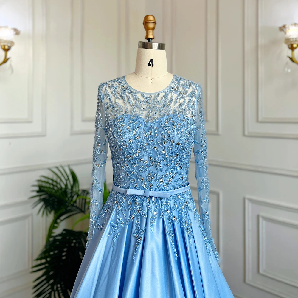 Muslim Blue A Line O Neck Luxury Lace Beaded Arabic Long Evening Dresses Gowns 2025 For Women Wedding Party LA71984