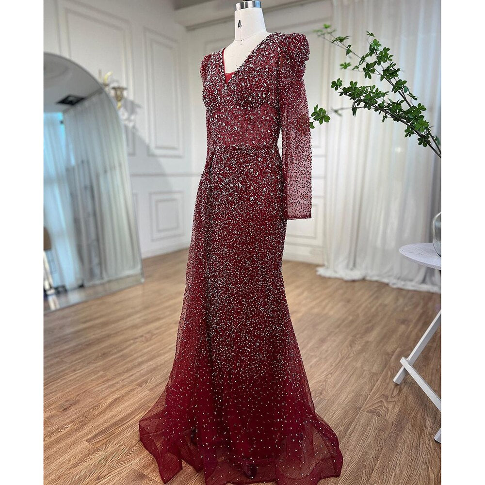Muslim Designer Luxury Wine Red Mermaid V Neck Beaded Evening Dresses Gowns For Women Wedding Party 2025 LA72148