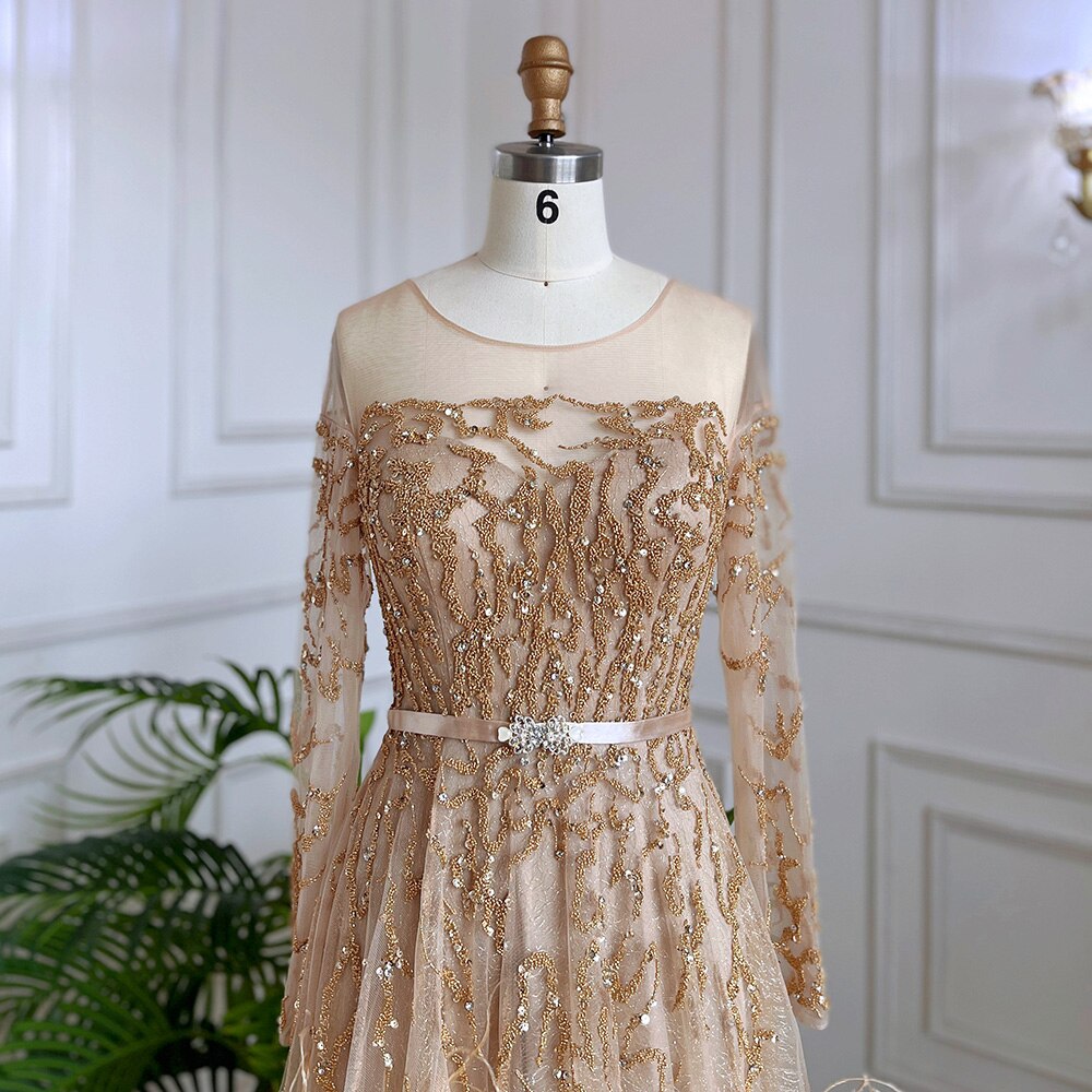 Muslim Gold A Line Lace Beaded Feathers Arabic Luxury Evening Dresses Gowns 2025 For Women Wedding Party LA71935