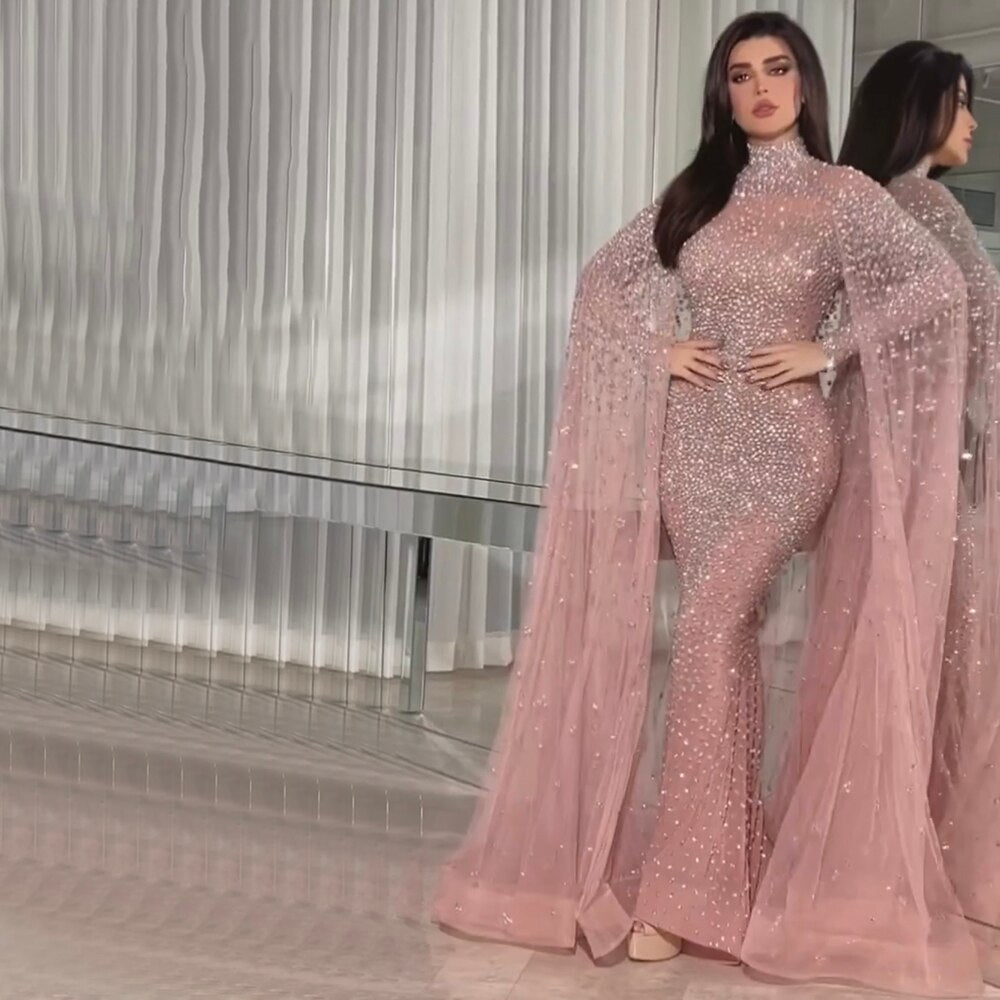 Muslim Gold Mermaid Elegant Cape Sleeves Beaded Luxury Dubai Long Evening Dresses Gowns 2025 For Woman Party LA71990