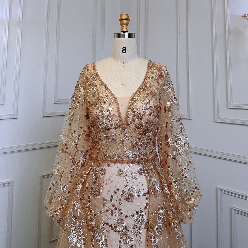 Muslim Gold Mermaid Elegant Puff Sleeves V-Neck Luxury Beaded Evening Dresses Gowns 2025 For Women Party LA71761
