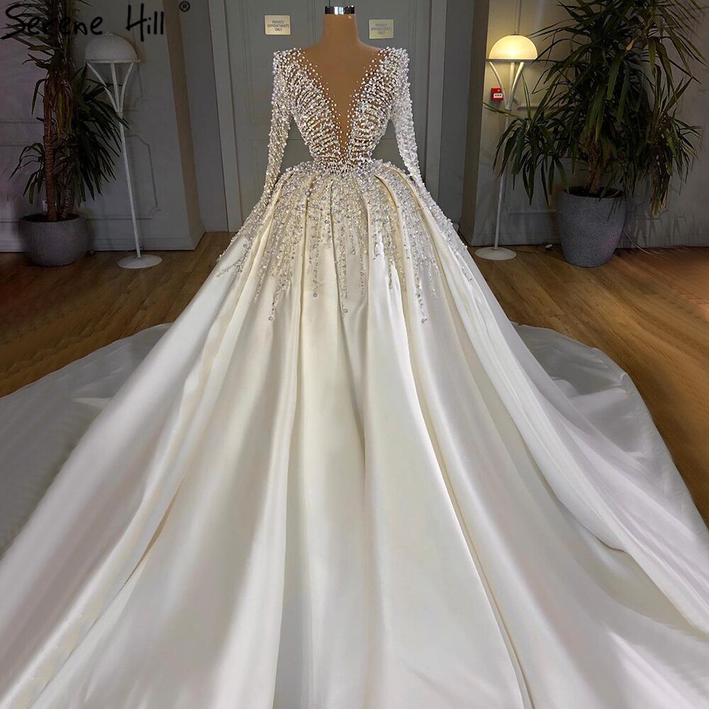 Muslim Ivory Satin Luxury Wedding Dresses Gowns 2025 Beading Pearls Sexy Bride Dress HM67210 Custom Made