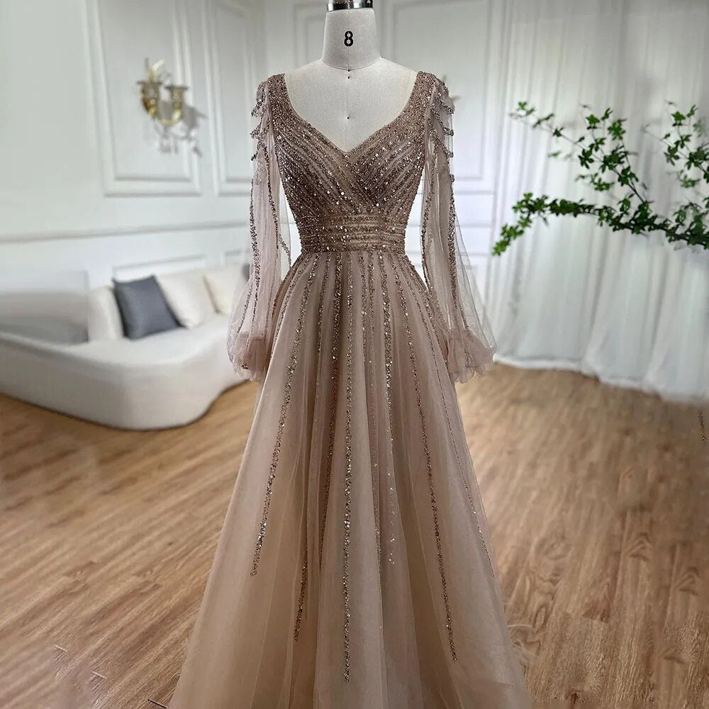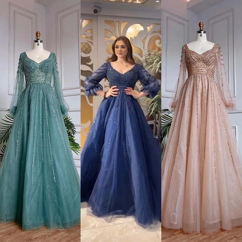 Muslim Navy Blue A-Line Beaded Luxury Arabic Evening Dresses Gowns 2025 For Women Wedding Party LA71867
