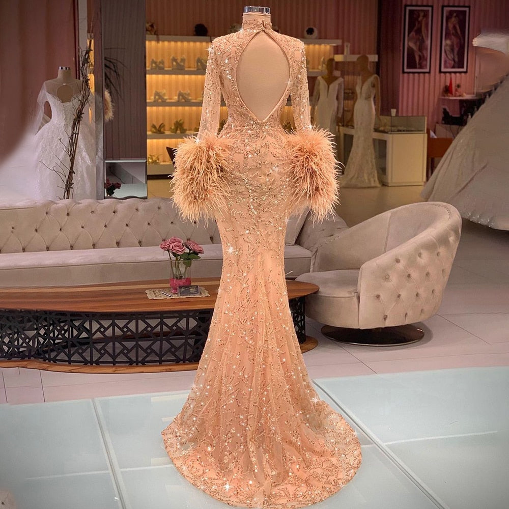 Muslim Rose Gold Elegant Evening Dresses Gowns 2025 Feather Beaded Mermaid Luxury For Women Party LA71514