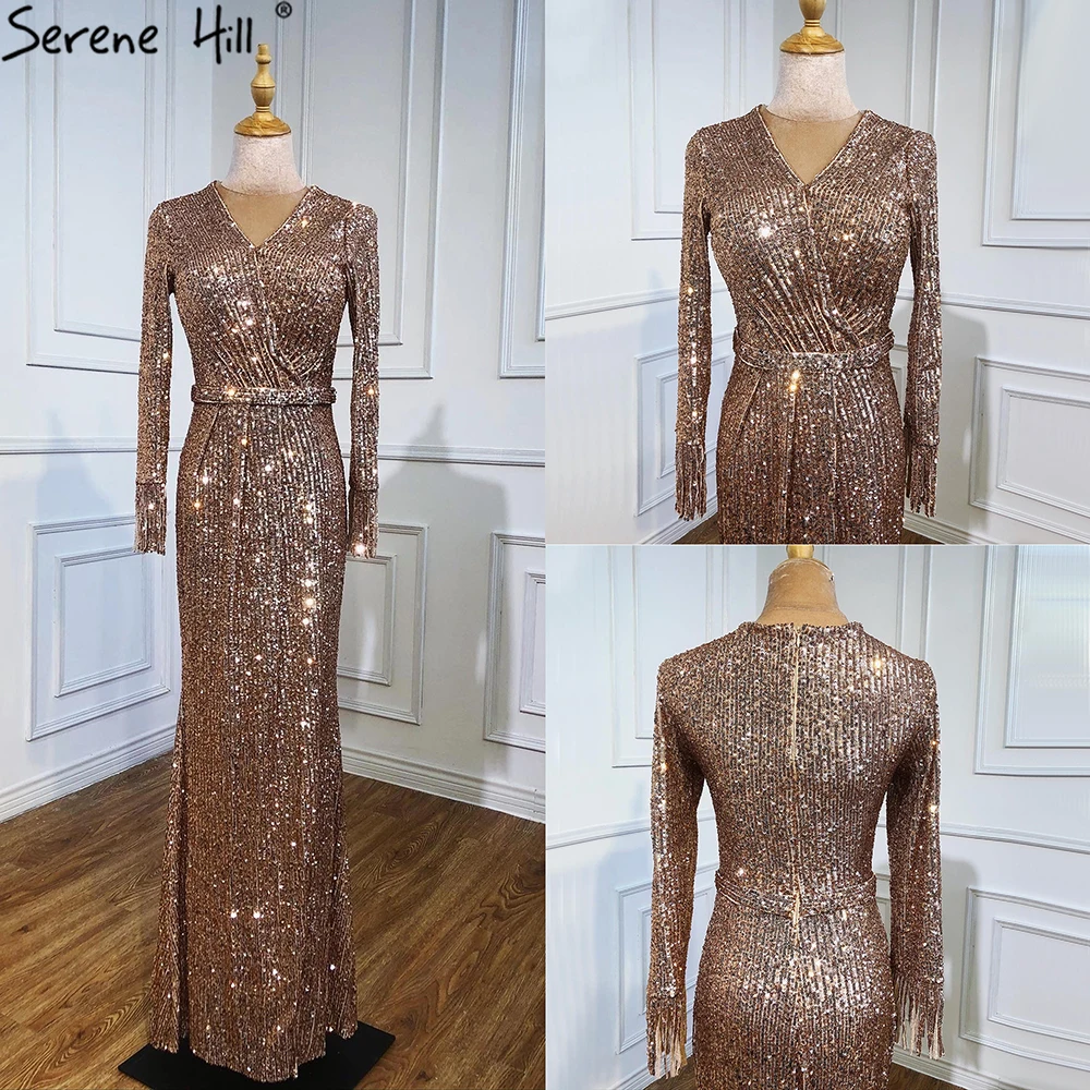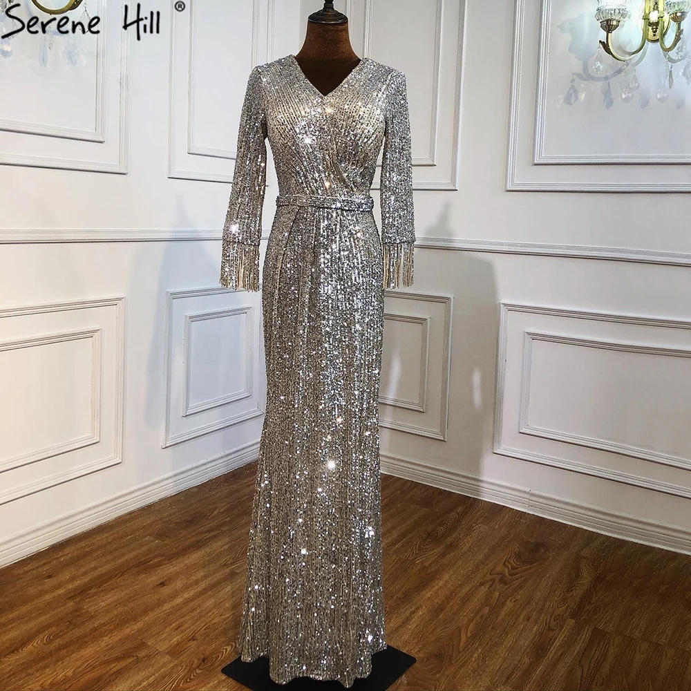 Muslim Silver Long Sleeves Evening Dresses Gowns 2025 Elegant Mermaid Sparkle Luxury For Women Party LA70784