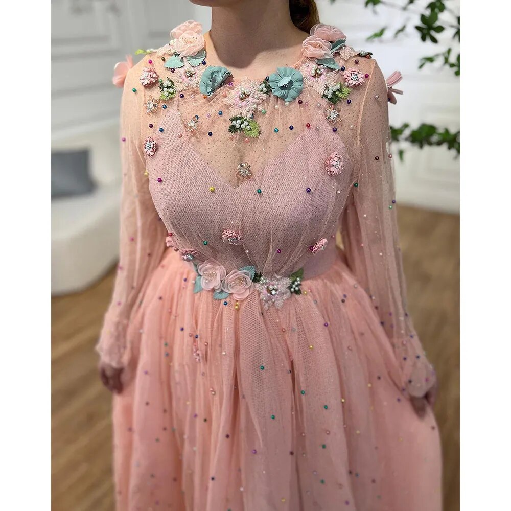 Pink A Line O Neck Long Sleeve Dubai Evening Dresses Design 2025 Handmade Flowers Pearls Evening Gowns LA60766