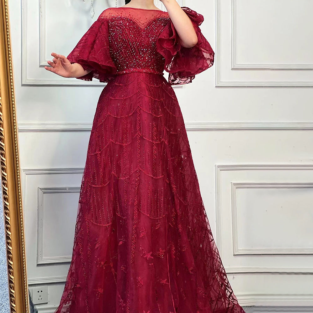 Pink Luxury A-Line Evening Dresses Gowns 2025 Flare Sleeves Beaded For Women Party LA71600