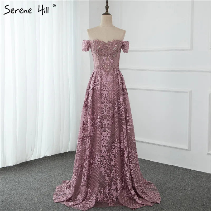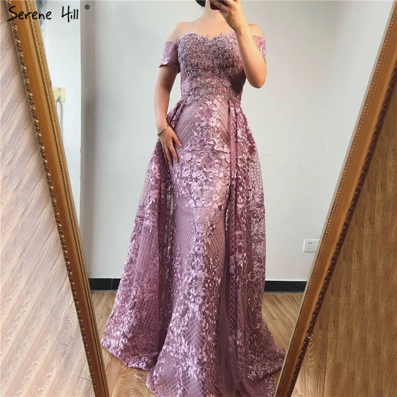 Pink Mermaid Elegant Short Sleeve Flowers Evening Dresses 2025 Dubai Sexy Off Shoulder Lace Crystal Gowns LA70200
