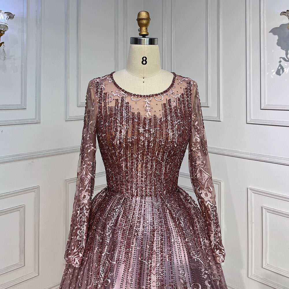 Pink Muslim A Line Long Sleeves Evening Dresses Arabic Luxury Beaded Gowns 2025 For Women Wedding Party LA70552A