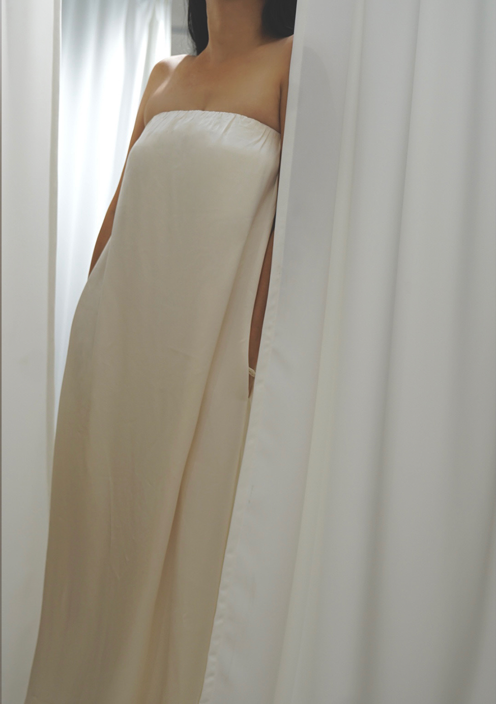 Experience ultimate luxury with our Owena silk wool gown. a masterpiece from our silk studio. This strapless. floor-length dress combines the sheen of silk with the warmth of wool for a comfortable. sophisticated silhouette. Handcrafted to perfection. it's a timeless addition to any wardrobe. ideal for special occasions.