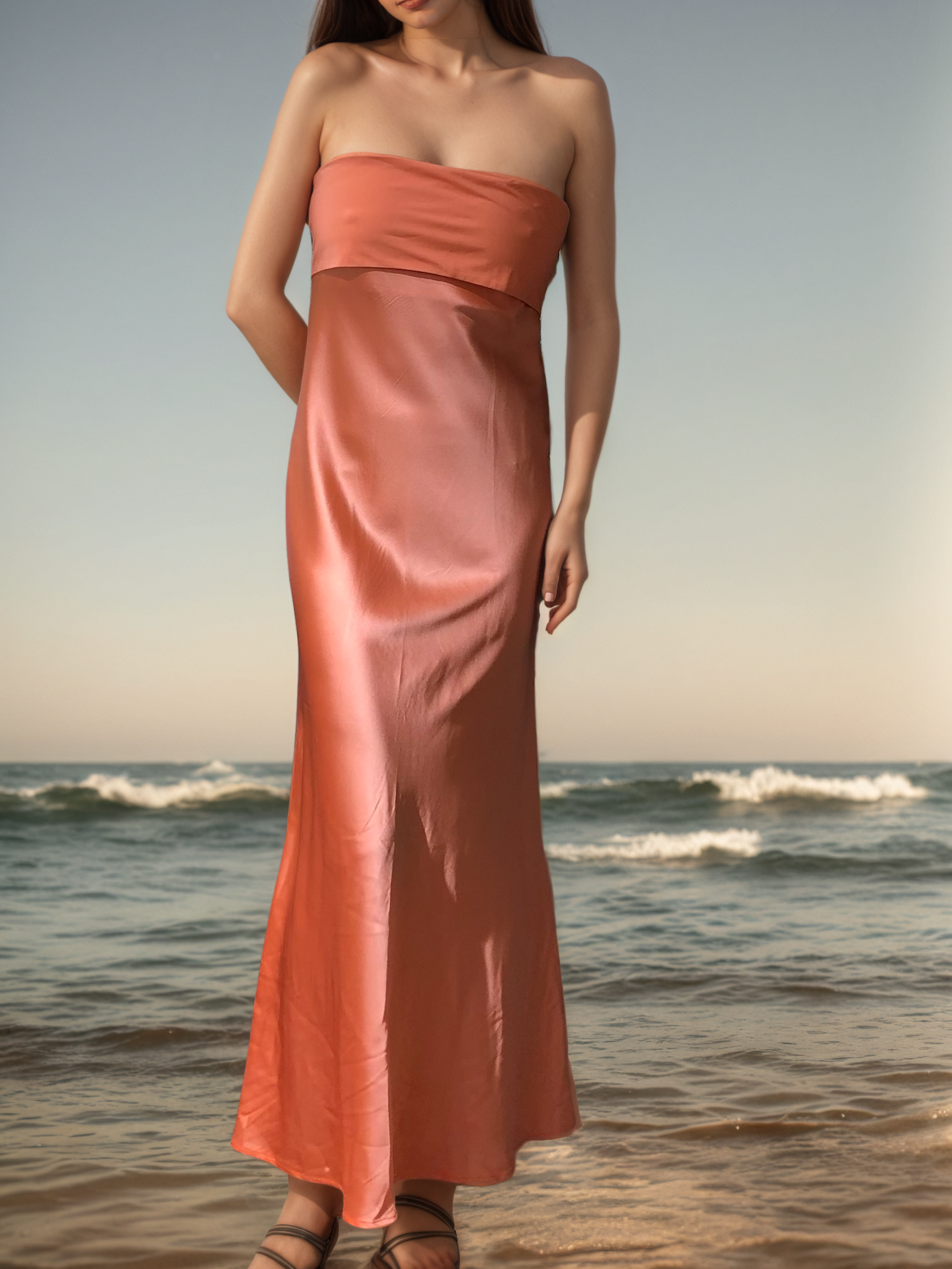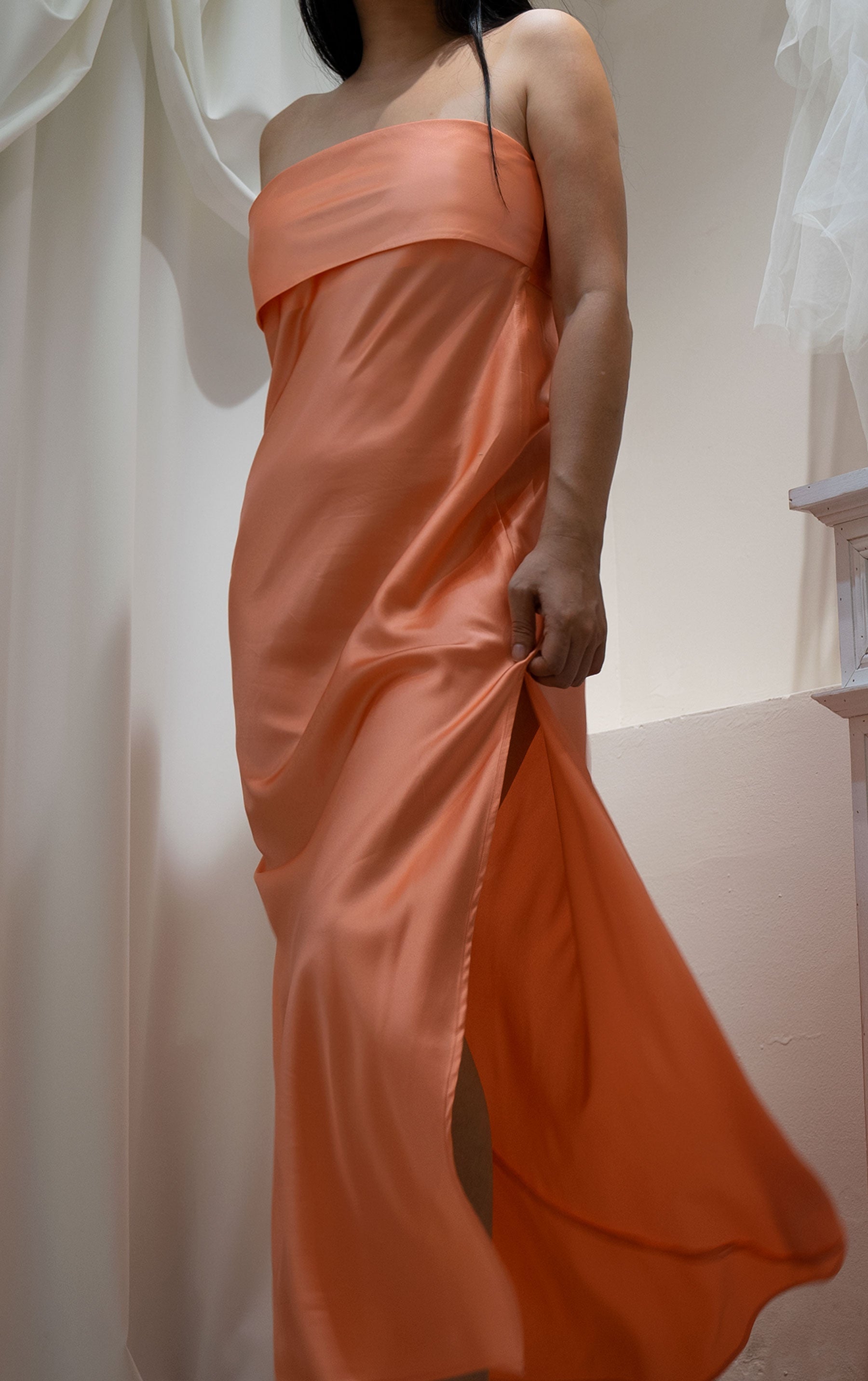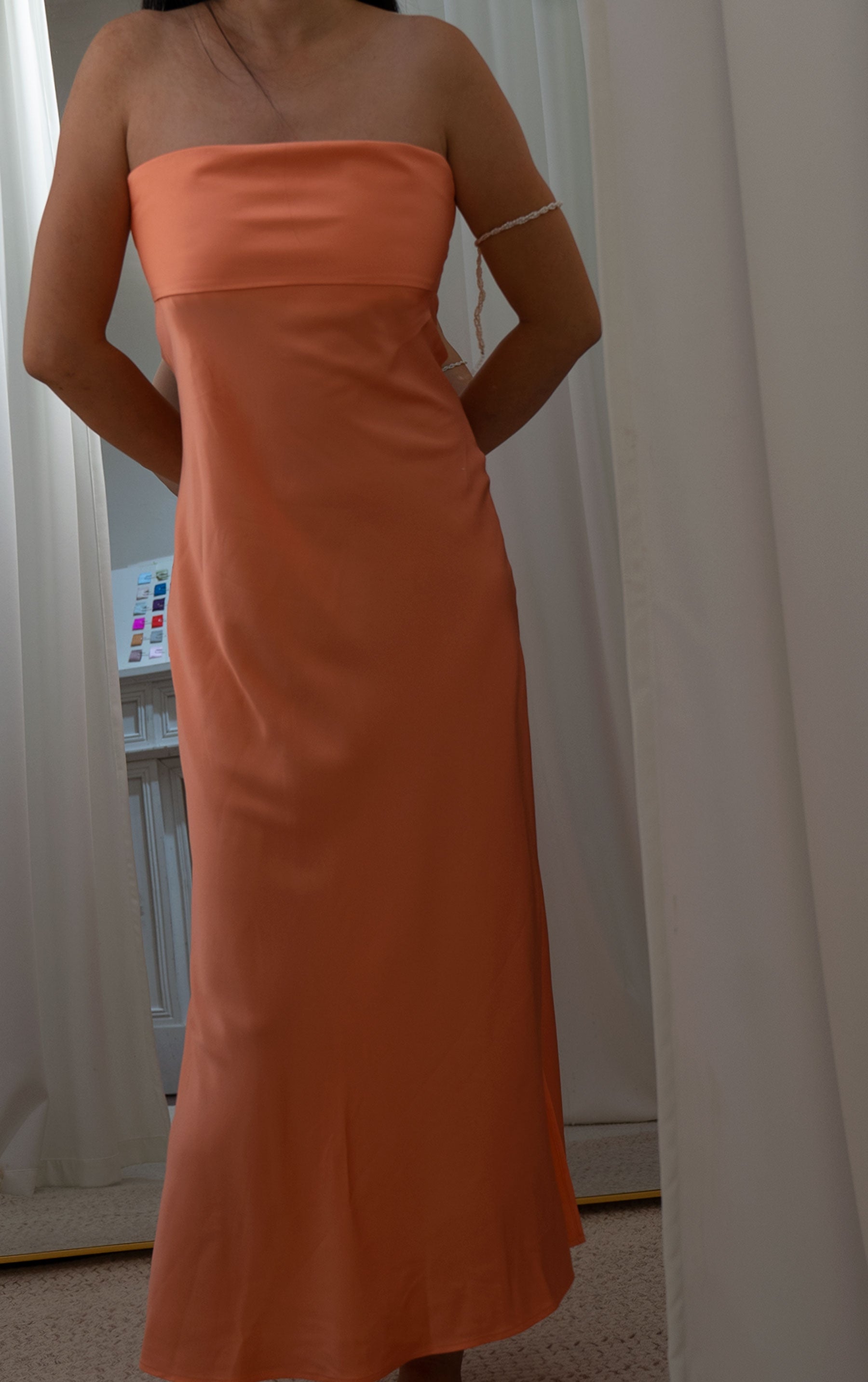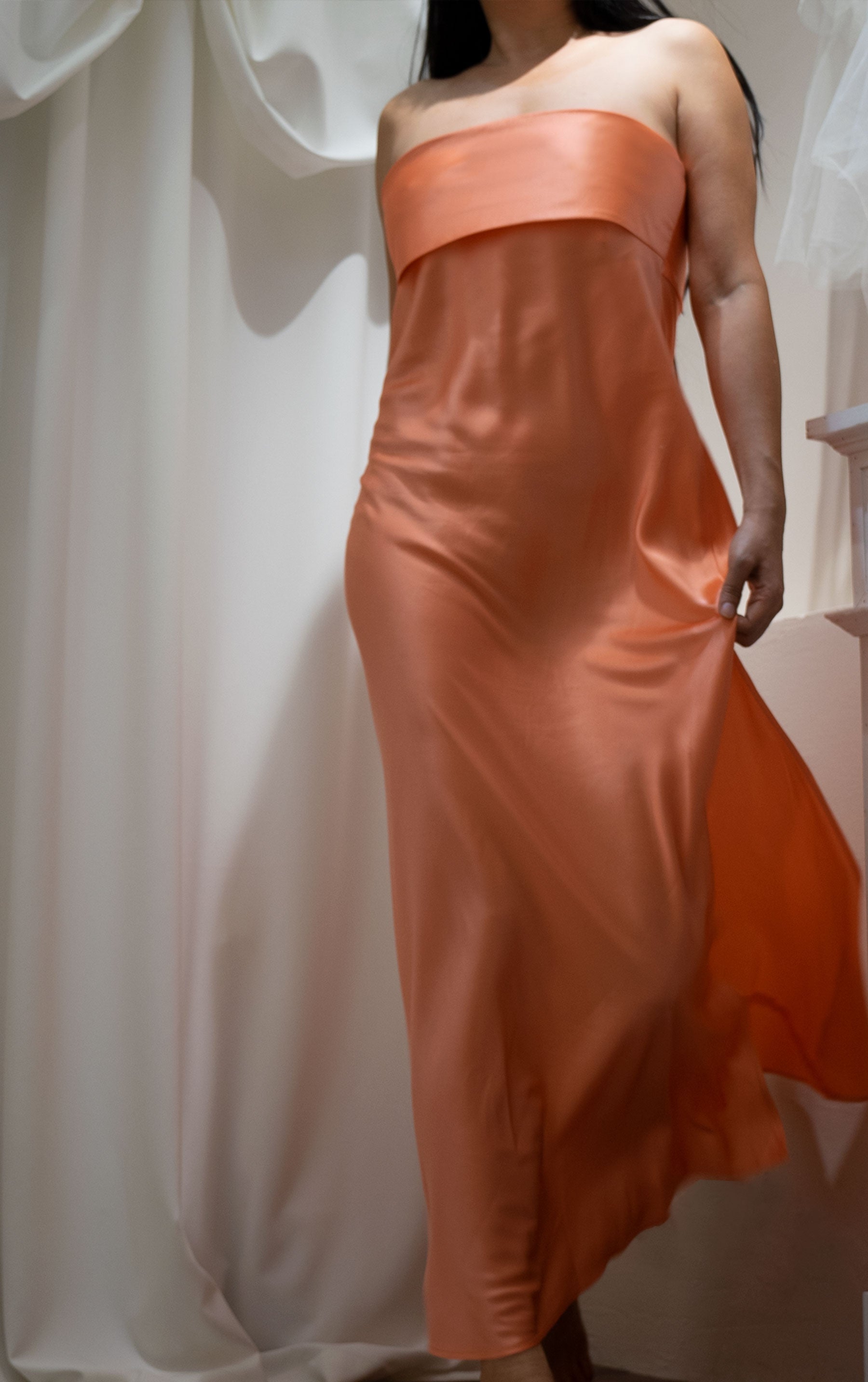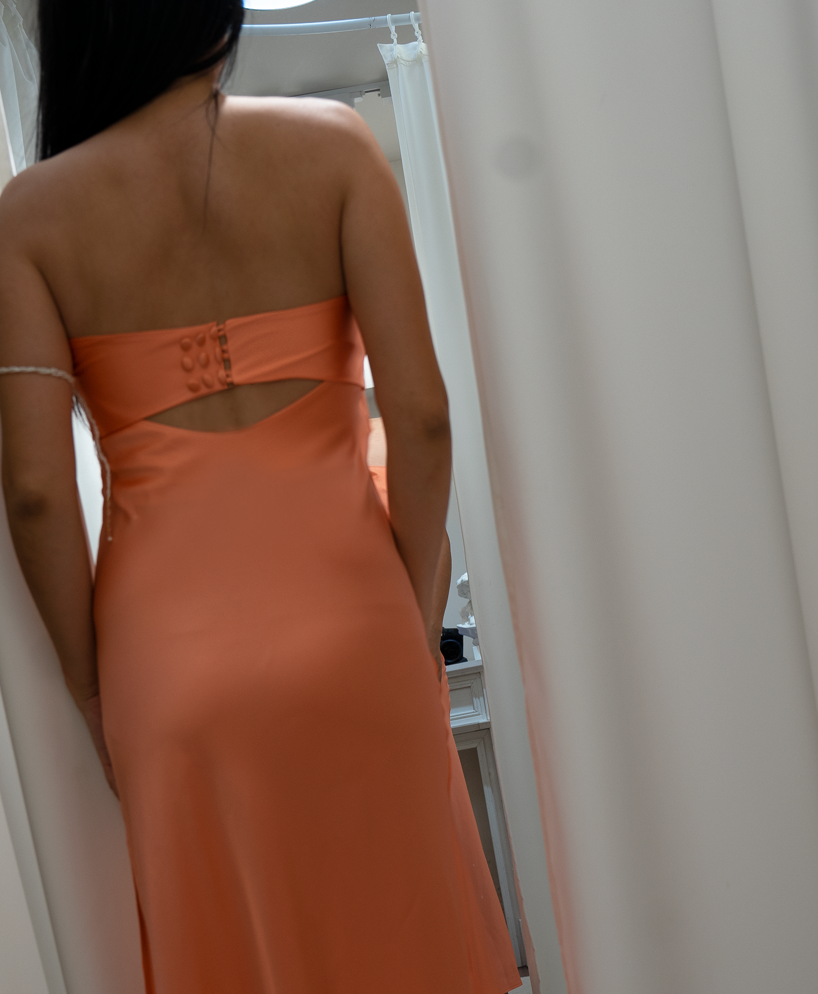 /Model wearing Laleh dress in Color :# 45 Salmon buff